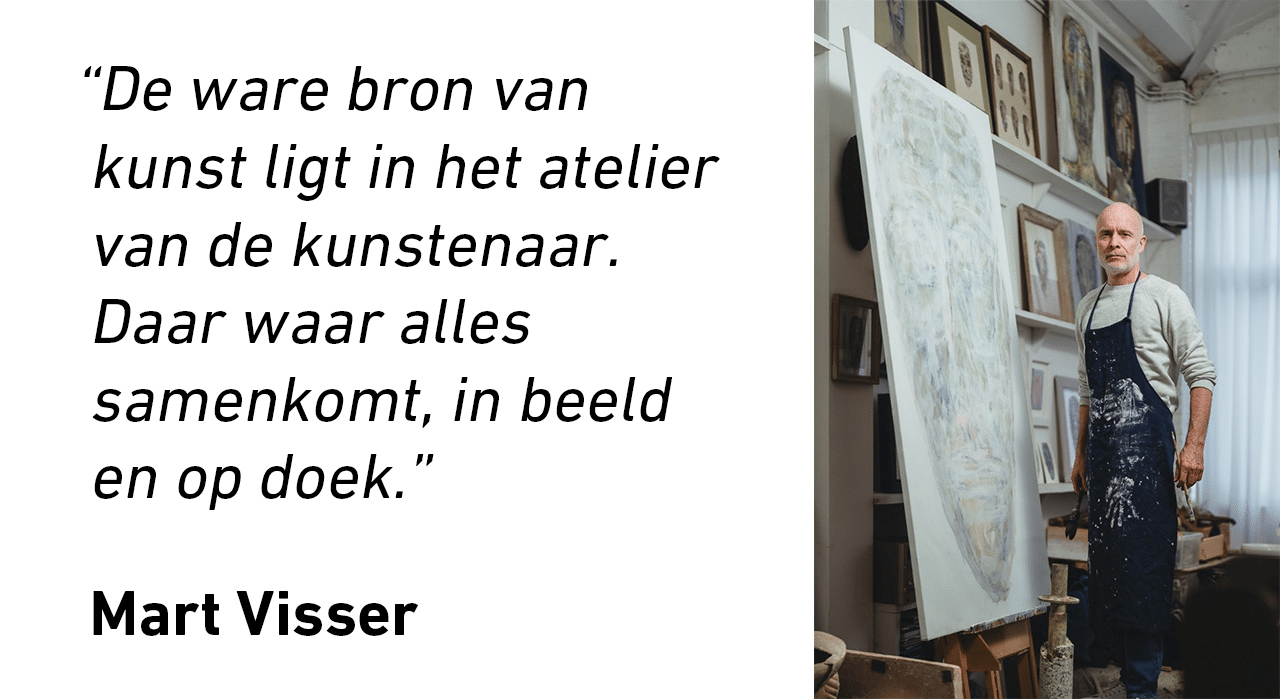 Visser – bij het grote publiek vooral bekend om zijn couture – toont met een imposant overzicht van schilderijen, sculpturen en installaties vooral de ontwikkeling van Mart Visser de kunstenaar. Zijn kunstenaarschap wordt weerspiegeld in immens grote gezichten, zwaar verroeste objecten en fragiele installaties.