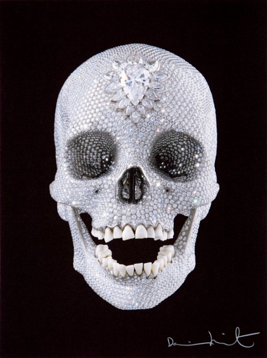 Wellicht het meest bekende werk van Damien Hirst is “For the Love of God” uit 2007, een platina afgietsel van een schedel van een 18e-eeuwse Europeaan, bezet met 8601 diamanten, waarvan een roze van 52,4 karaat. Het kunstwerk “For the Love of God” heeft een waarde van omgerekend zeker 75 miljoen euro, aldus Britse media.