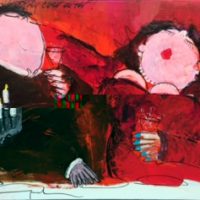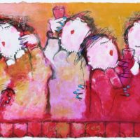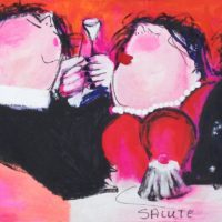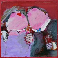 Gerdine portrays her figures in unguarded moments with gentle satire, capturing their vulnerable and uncertain selves when they, believing themselves unobserved, briefly attempt to escape from a world where status, knowledge, protocols, and power confine them. Her dining and drinking scenes are created without a fixed plan. Inspired by a color or a feeling, she sees the humorous figures emerge from the layers of paint, waiting beneath the surface. Color, feeling, harmony, and movement define the image. With a sense of humor, Gerdine Duijsens’ work evokes emotion in the viewer. Pure lyrical expressionism. Looking at Gerdine Duijsens’ paintings, we see ourselves. There’s no resisting it—a smile plays on our lips, a chuckle rises from our diaphragm. This is why we want her canvases on our walls: they tell us something about ourselves. Because they are real.