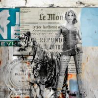 Terrani’s décollages represent fragments, thoughts, observations, and sometimes even short stories, revealing details that were overlooked in the original images. Icons of today’s fast-paced life, such as Paris Hilton as ‘Stupirella,’ David Beckham as ‘The Ribbelin Kid,’ Heidi Klum, and Angelina Jolie, appear, as do reflections on the fleeting nature of Frank Sinatra, Audrey Hepburn, Romy Schneider, and James Dean. His updated décollages are pluralistic, blending an era of retrospectives with a careful journalistic and biographical approach, laying a new foundation in collage art. From this perspective, Terrani intelligently uses contemporary techniques, and his timeless fragments are a significant addition to contemporary art movements and photography.