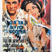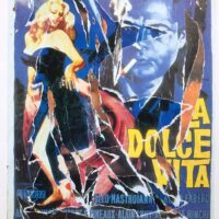 Mimmo Rotella (1918 – 2006), Italian visual artist, is known for being one of the earliest pioneers of Pop Art. In the lackluster Rome of Fellini’s La Dolce Vita, Rotella experimented with new forms of communication, such as advertising, film, and politics, ten years ahead of the later Pop Art movements. He would tear posters from the walls of the Eternal City, paste them onto canvas, and manipulate them to create a new vision of mass media by removing them from their usual context and tearing them apart. By ripping apart the iconic faces of the silver screen, he removed them from collective imagination and, with dynamic enthusiasm, transformed them into works of art. His paintings of Marilyn Monroe, Charlie Chaplin, Sophia Loren, Liz Taylor, Marlene Dietrich, Rita Hayworth, Clark Gable, and John Wayne acquire a new significance through Rotella’s intelligent interpretation, turning idols into reflections of a society marked by dehumanization, often with a touch of humor in the tradition of Nouveau Réalisme.