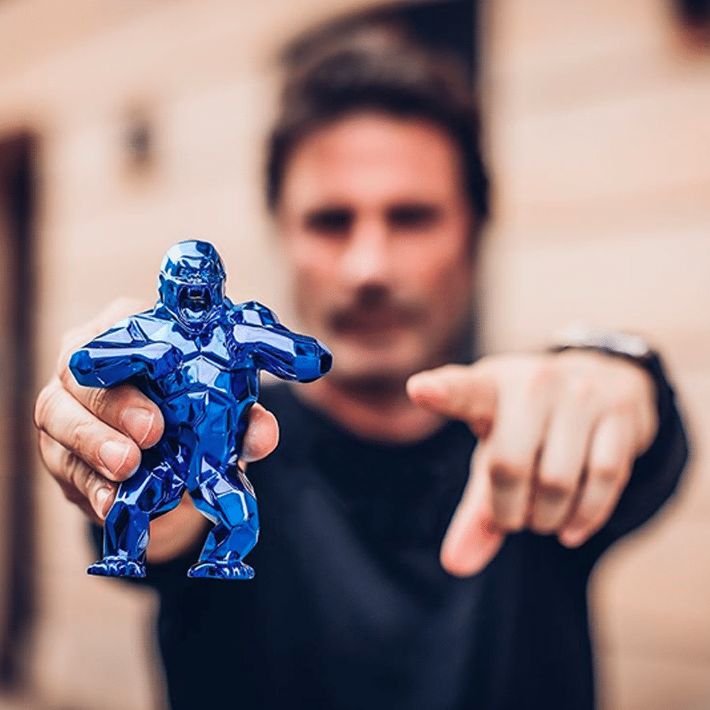 Richard Orlinski’s monochrome, diamond-cut sculptures of animals and cultural icons have earned the artist worldwide recognition. Inspired by pop artists such as Jeff Koons, Takashi Murakami, and Robert Indiana, Orlinski uses industrial materials like resin and aluminum to create brightly colored and glossy depictions of bears, panthers, and his signature figure, King Kong. His overarching artistic theme, “Born Wild,” emphasizes the duality between animal and human nature within all of us, illustrating how humanity can transform its wildest instincts into something refined. A former architect and interior designer, Orlinski has exhibited his works in prestigious galleries and events such as Art Basel, FIAC, Art Élysées, and the Palace of Versailles, as well as in outdoor spaces like the French Alps in 2018, where skiers could glide past his giant animals. Since 2015, Orlinski has been recognized as one of the most successful French contemporary artists worldwide.