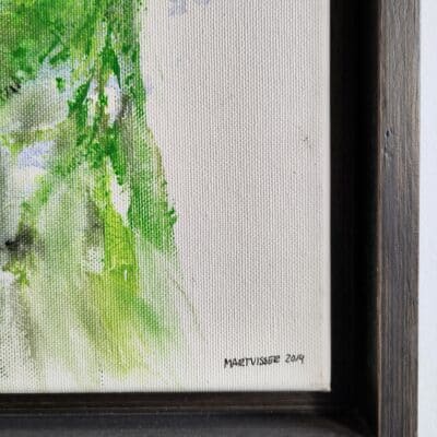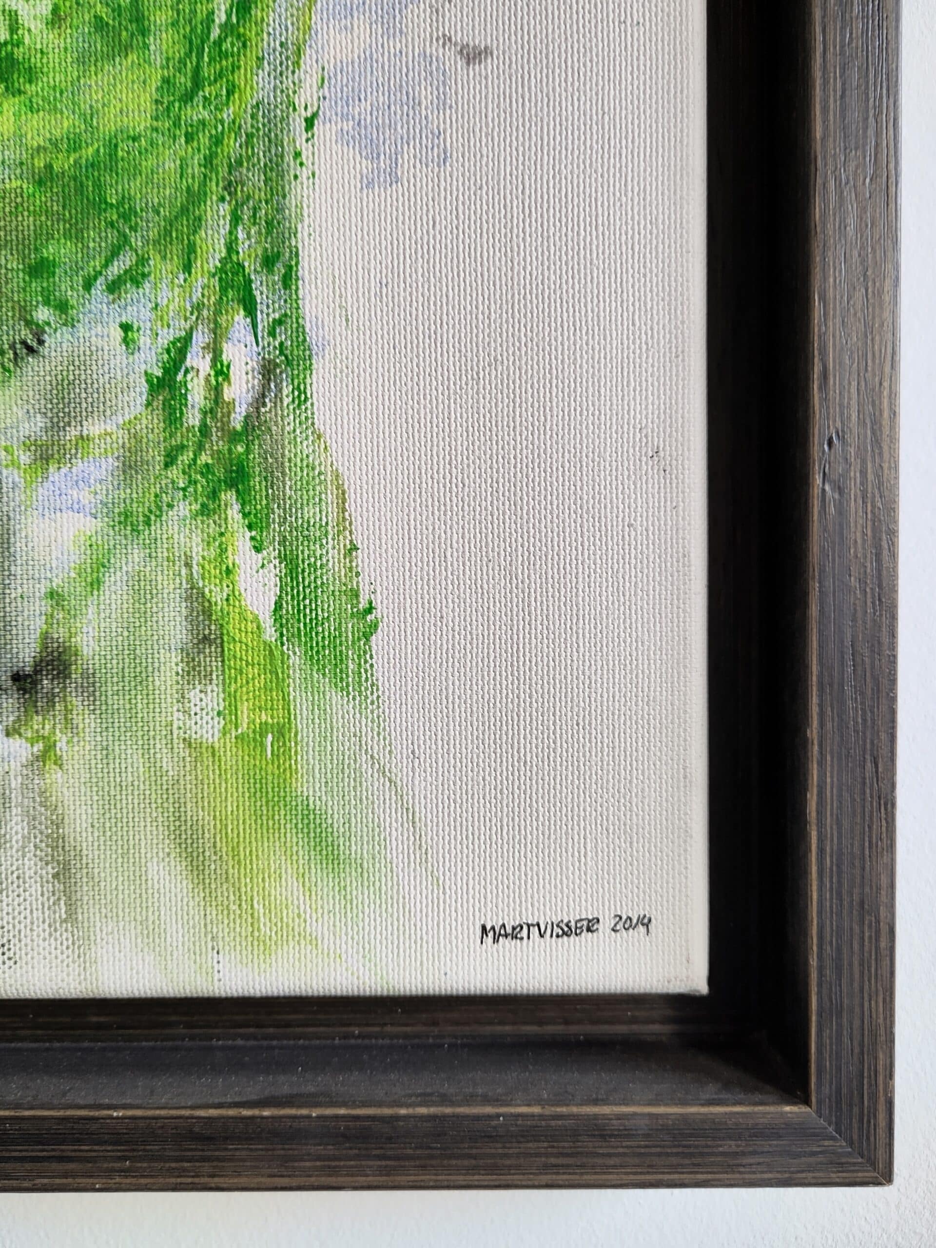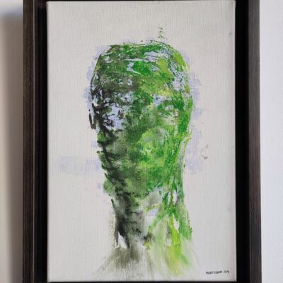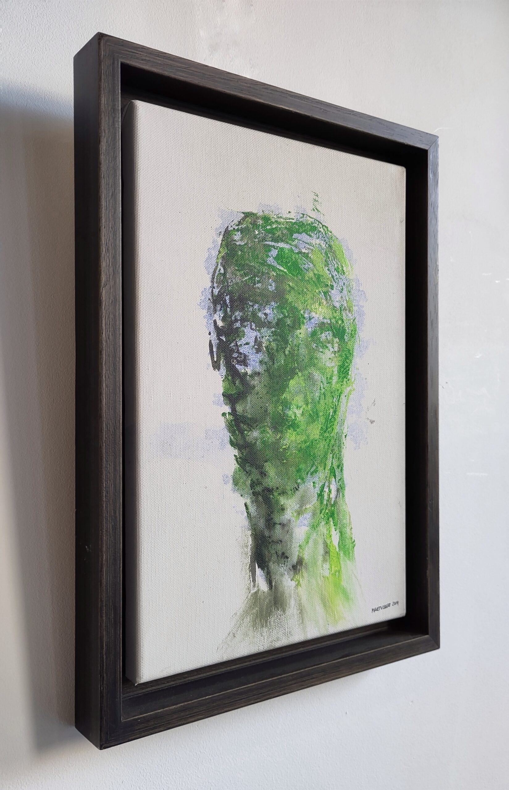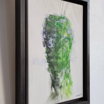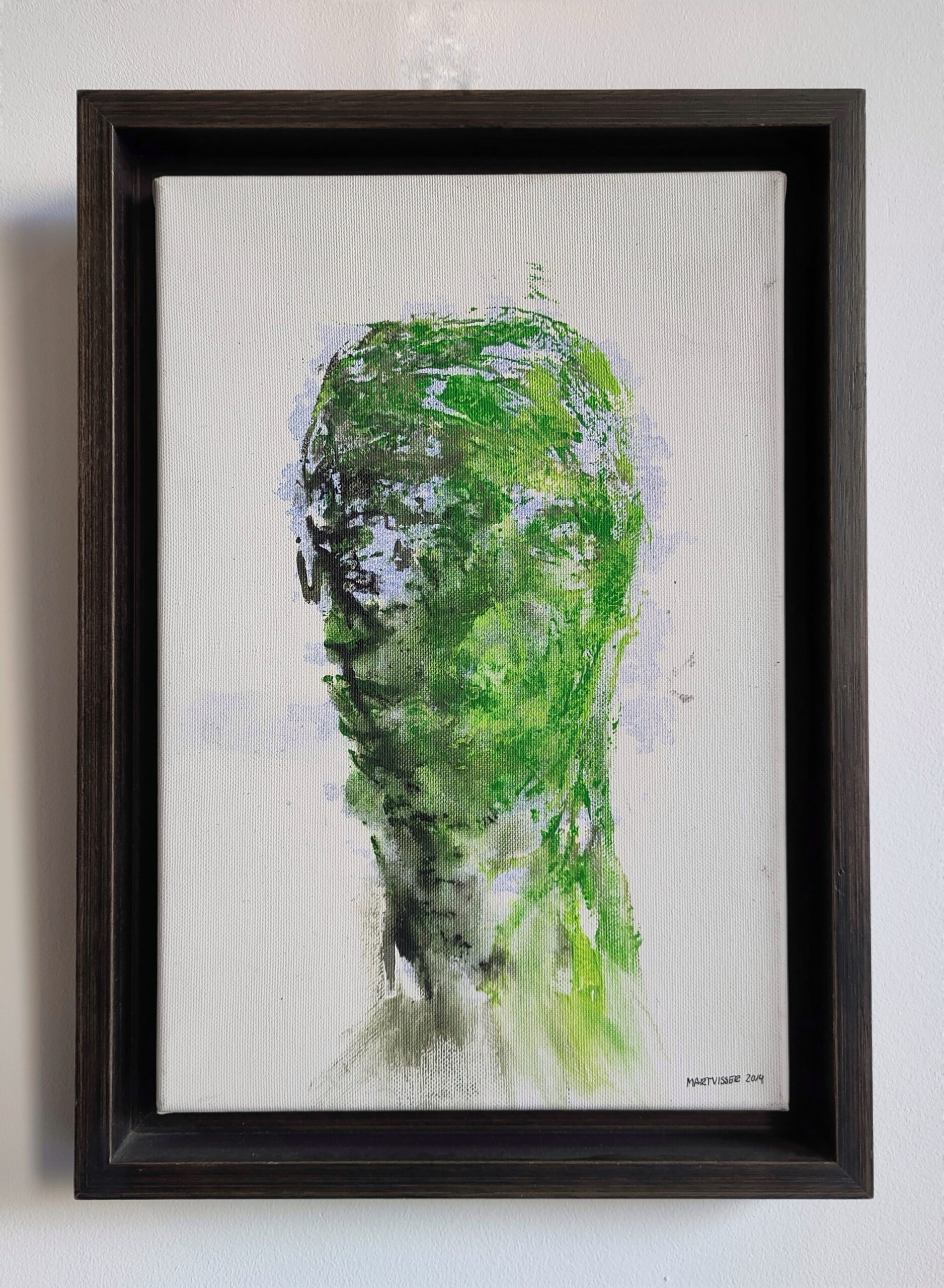 Dit expressieve portret is opgebouwd uit transparante lagen en levendige groentinten die subtiel overlopen in zwart en wit. De losse, bijna vloeibare penseelvoering geeft het gezicht een vluchtig en organisch karakter. Het werk ademt frisheid en beweging, waarbij de contouren lijken te vervagen. Een intrigerend stuk dat lichtheid en diepte samenbrengt in een modern interieur.