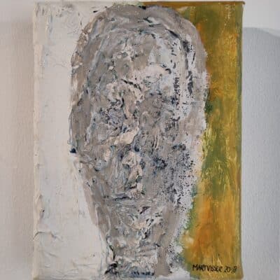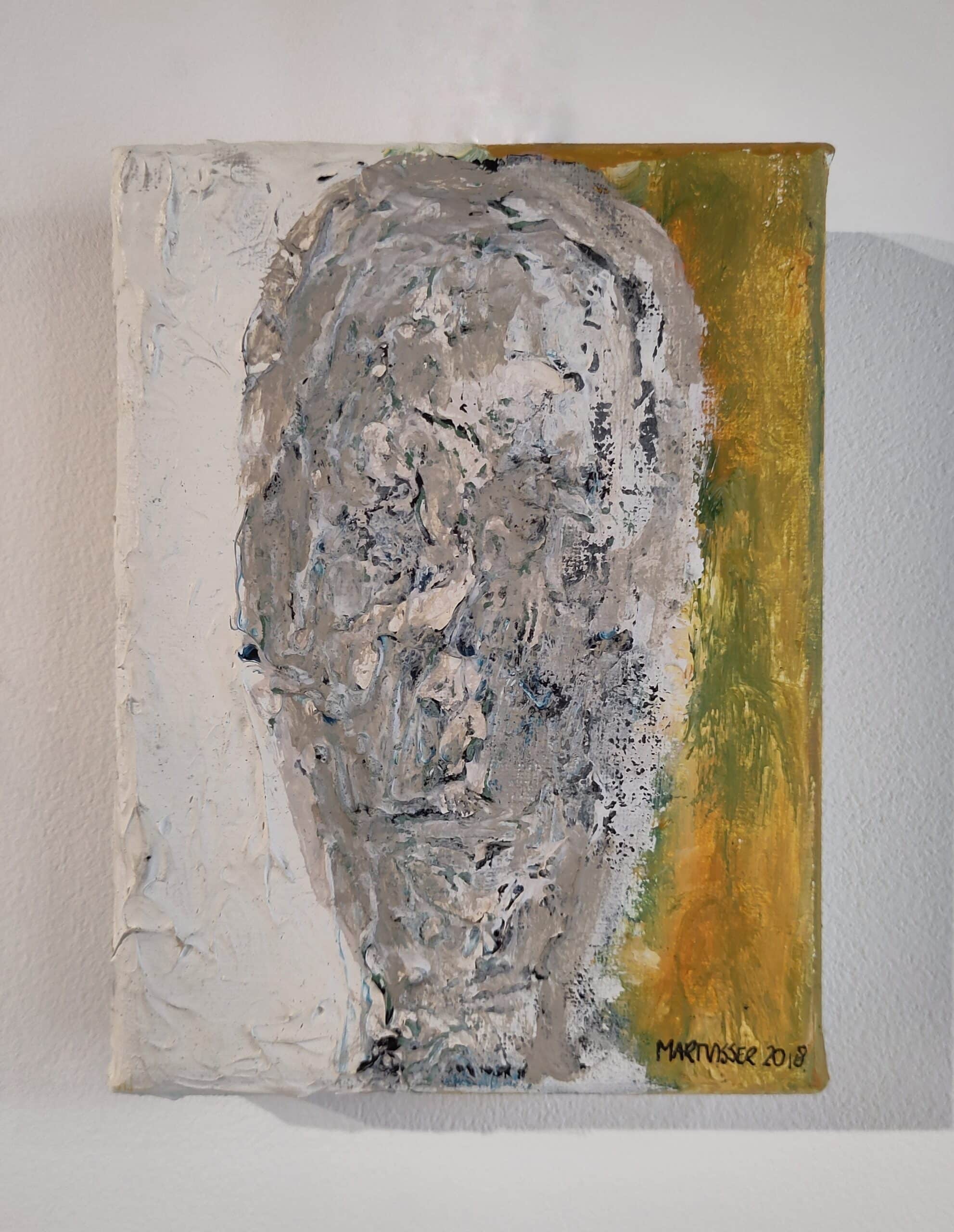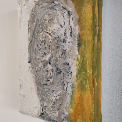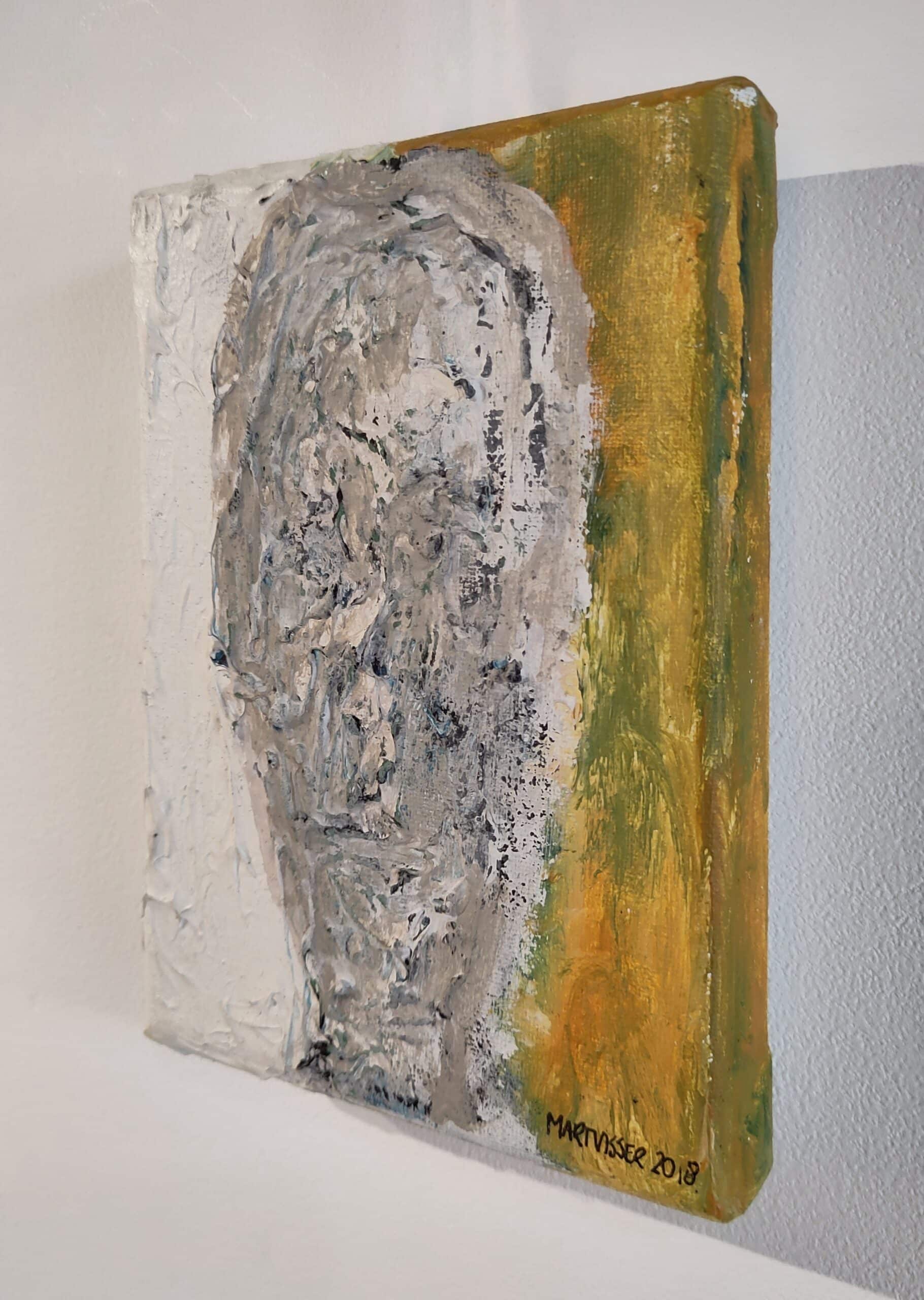Dit compacte portret is opgebouwd uit gelaagde, pasteuze verf en een ingetogen palet van wit, grijs en aardse groentinten. De abstracte gezichtsstructuur lijkt langzaam uit het oppervlak tevoorschijn te komen, waarbij ruwe texturen en verfsporen een gevoel van tijd en kwetsbaarheid oproepen. De contrasterende achtergrond versterkt de sculpturale werking van het hoofd. Een intens en verstild werk dat, ondanks zijn bescheiden formaat, een krachtige aanwezigheid heeft in een hedendaags interieur.