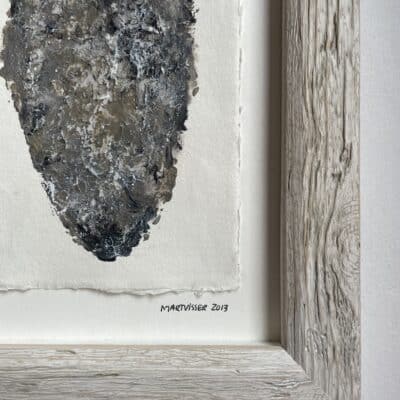 Een ingetogen portret opgebouwd in aardse tinten en grove textuur, met verfijnde nuances in grijs, beige en zwart. De structuur van het handgeschepte papier versterkt de natuurlijke, verstilde uitstraling. Een sereen en gelaagd werk waarin kwetsbaarheid en karakter samenkomen. Perfect voor een rustig en stijlvol interieur.