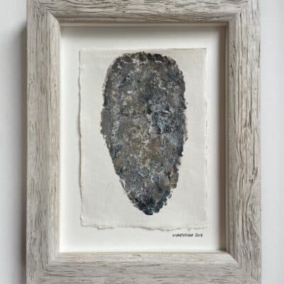 A subdued portrait built with earthy tones and coarse texture, featuring refined nuances of grey, beige and black. The handmade paper enhances its natural, contemplative presence. A serene and layered piece where vulnerability and character meet. Perfect for a calm and elegant interior.