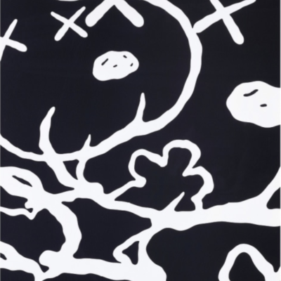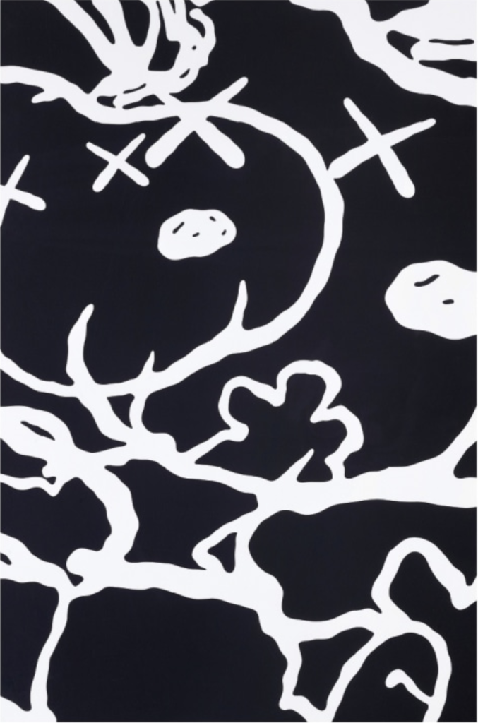 KAWS applies his instantly recognizable XX eyes to Charles M. Schulz’s iconic 1950’s “Peanuts” characters. KAWS has revisited “Peanuts” on numerous occasions, here abstracting Snoopy, Woodstock and their companions by superimposing their forms in alternating white-on-black and black-on-white. While exercising total control in all his works, KAWS replicates the jittery line of Schulz’s original drawings in “Man’s Best Friend” to create a frenzied network of monochrome.