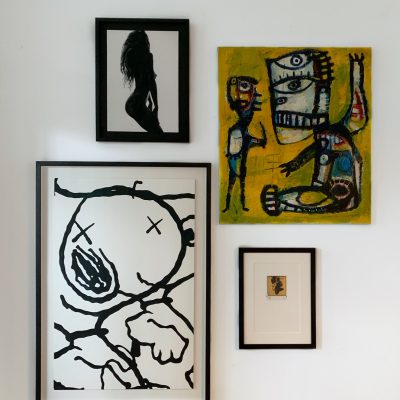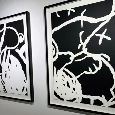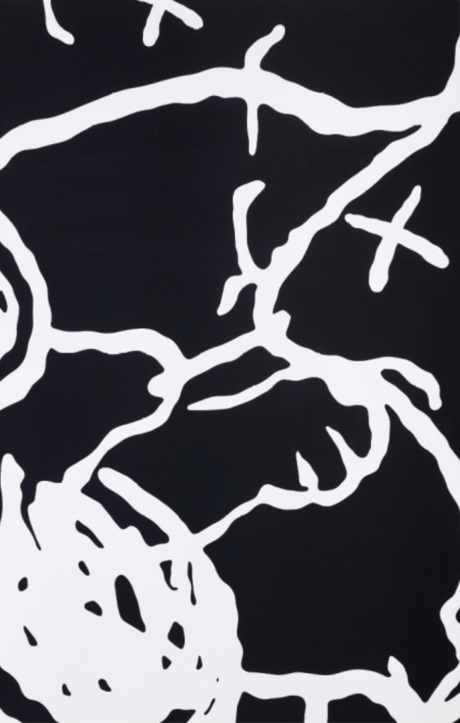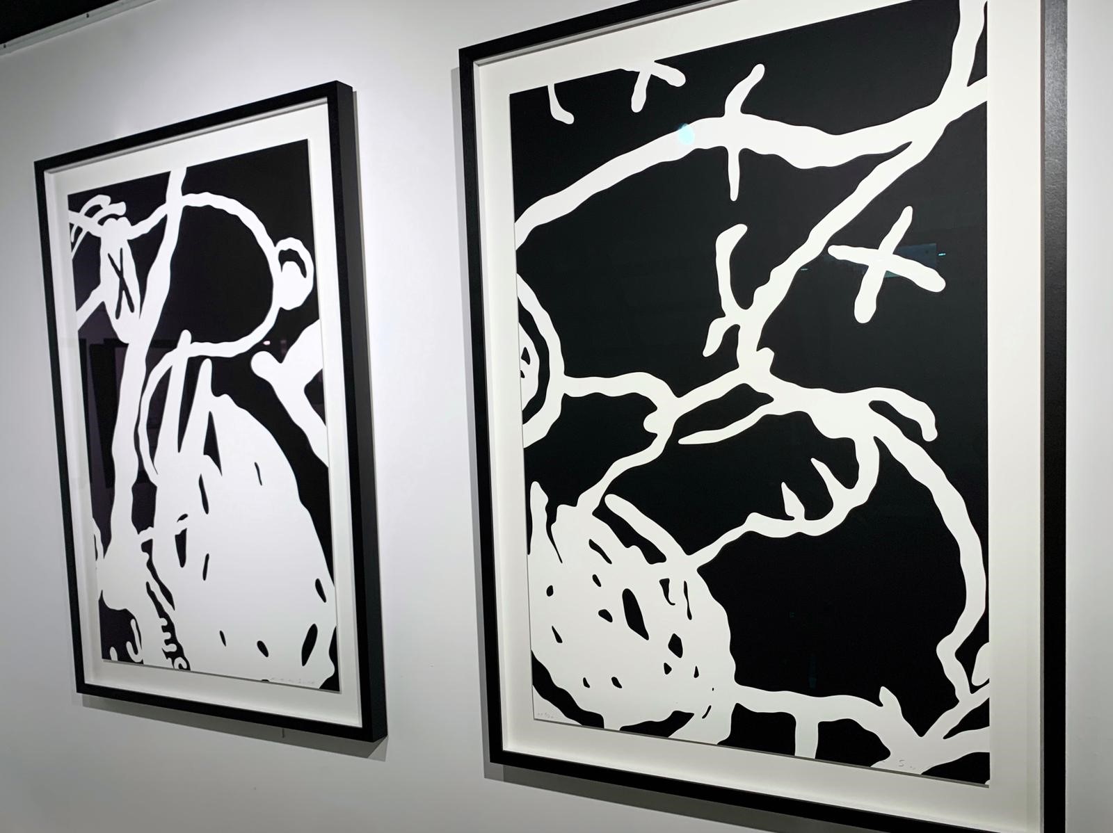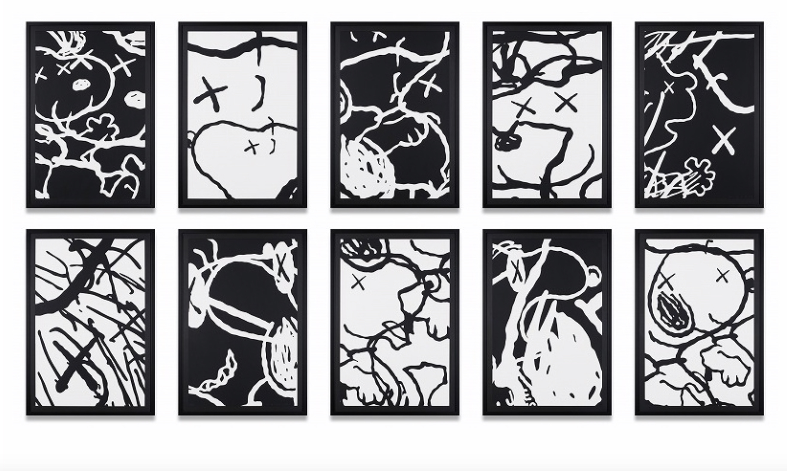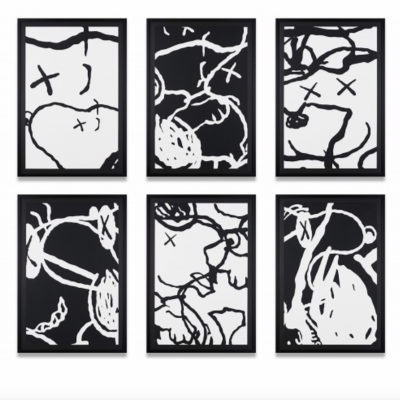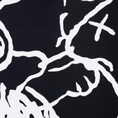 KAWS applies his instantly recognizable XX eyes to Charles M. Schulz’s iconic 1950’s “Peanuts” characters. KAWS has revisited “Peanuts” on numerous occasions, here abstracting Snoopy, Woodstock and their companions by superimposing their forms in alternating white-on-black and black-on-white. While exercising total control in all his works, KAWS replicates the jittery line of Schulz’s original drawings in “Man’s Best Friend” to create a frenzied network of monochrome.