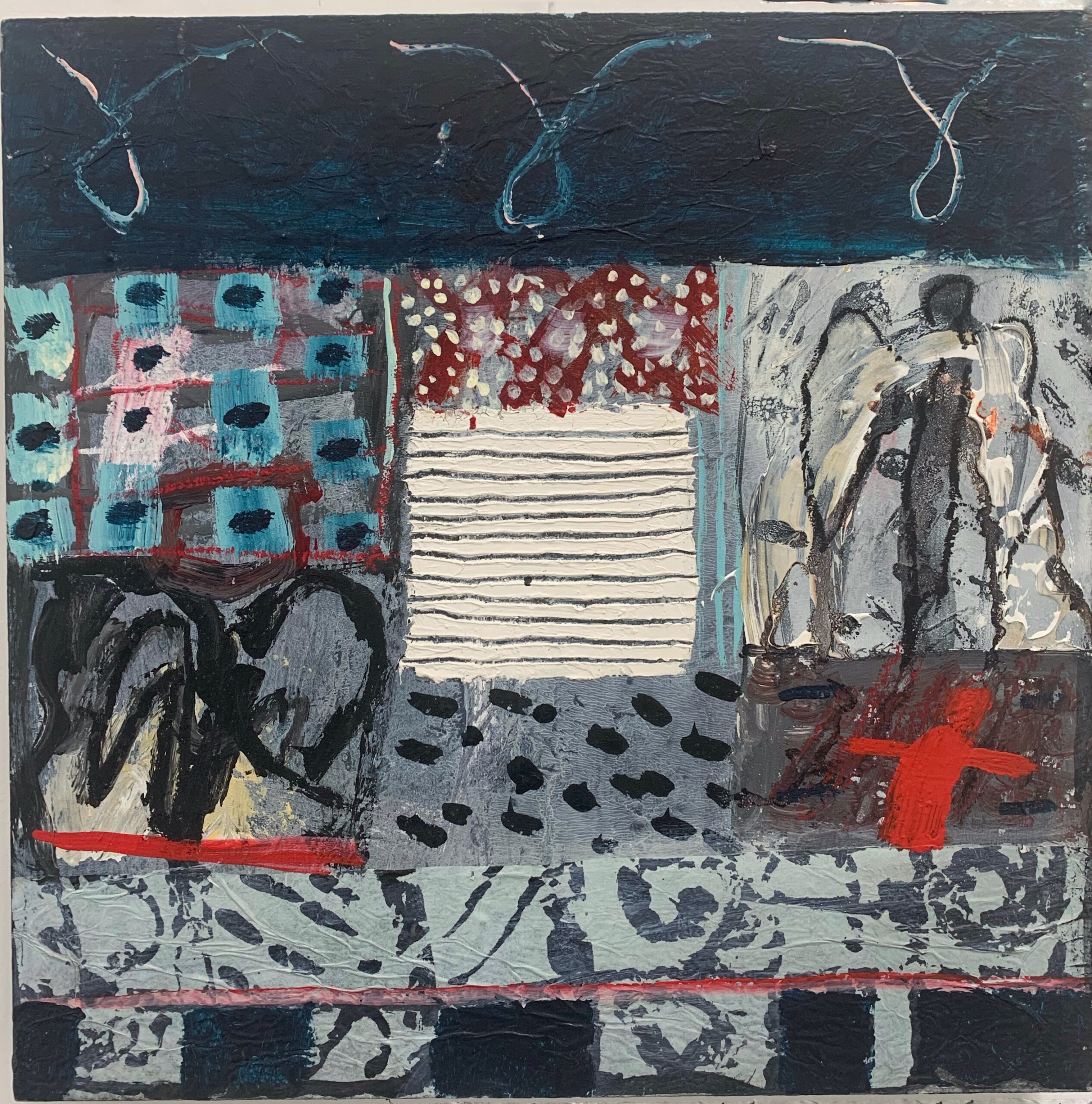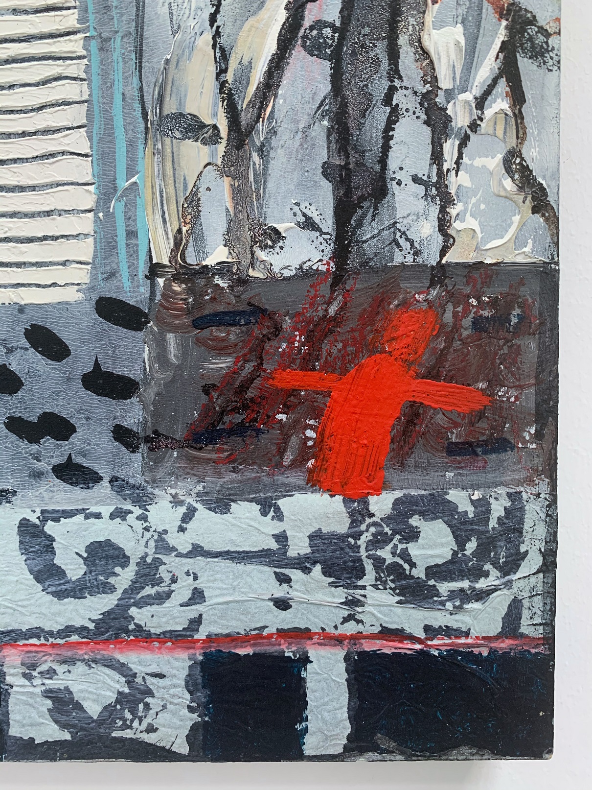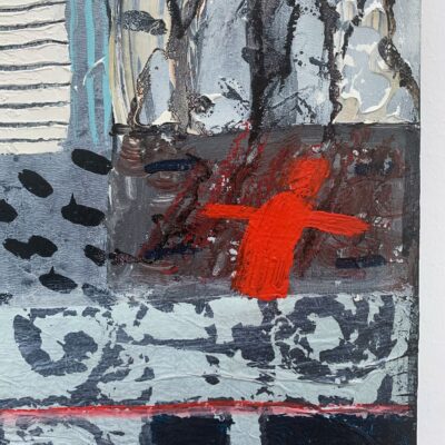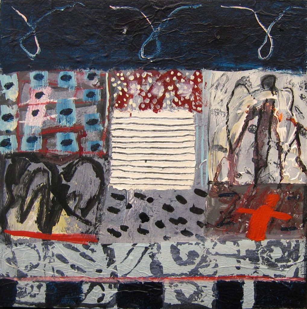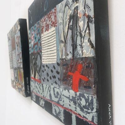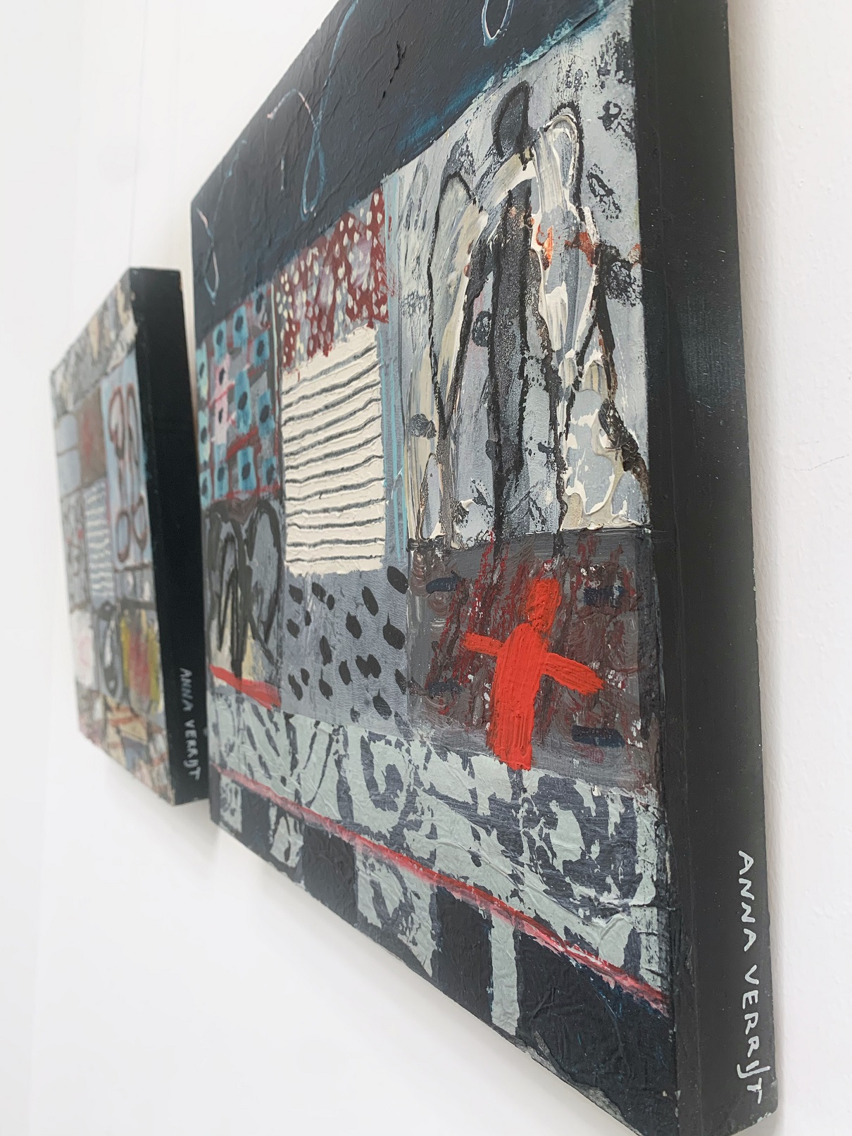1 van een fraaie serie kleinere werken op paneel van Anna Verrijt uit 2006. De stukken zijn opgebouwd uit vele transparante lagen, die allemaal min of meer zichtbaar zijn. Alle sporen van de bewerkingen van de kunstenares blijven ook in de stukken zichtbaar en zo is prachtig de ontstaansgeschiedenis af te lezen. De werken laten bij elke aanblik nieuwe ontwikkelingen zien en blijven de kijker daardoor keer op keer boeien!
