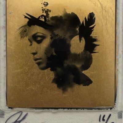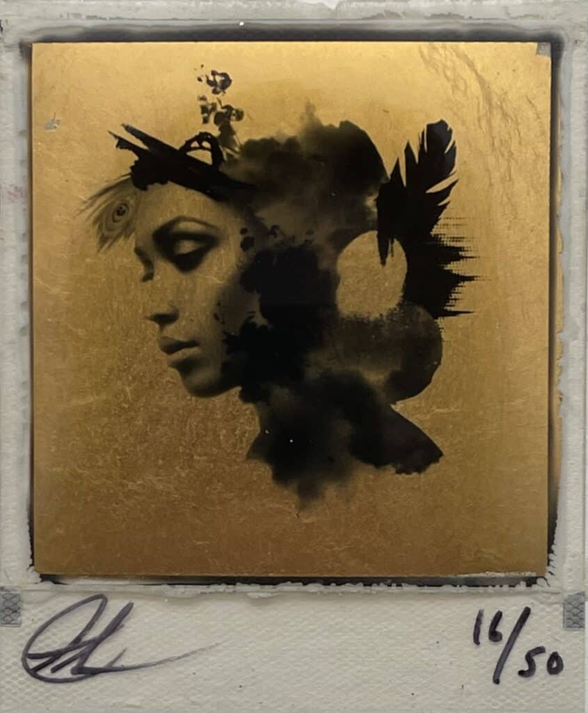 Original with 24ct gold leaf and holographic glitter processed polaroid in gold by Andrew Millar.