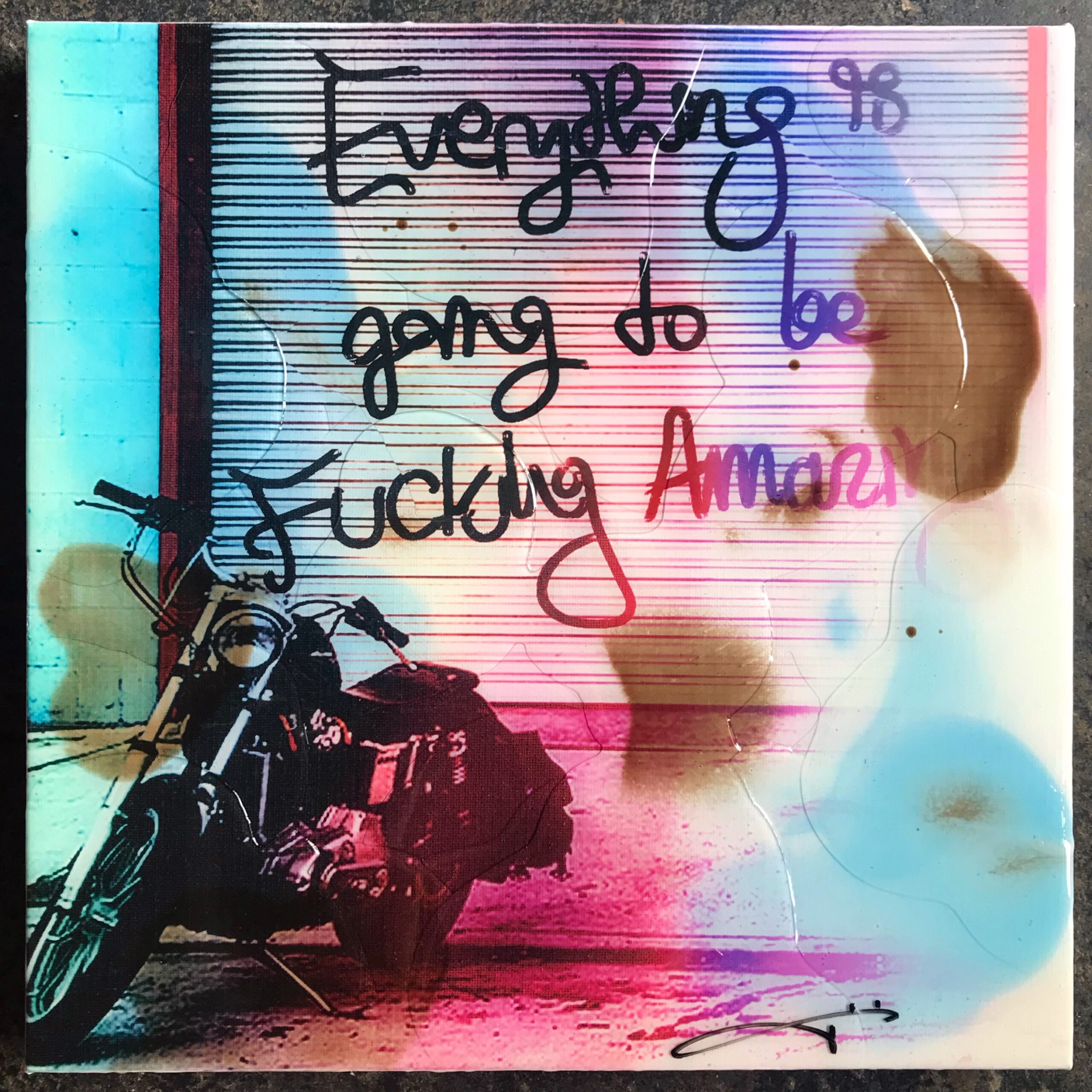 Mixed media monotype op linnen van de befaamde Duitse kunstenaar Jörg Döring. Het werk is door de kunstenaar opgebouwd uit fraaie heldere kleuren gecombineerd met foto’s, ruw geschilderde oppervlaktes, typografie en geschreven teksten. De monotypes zijn in een volledig met de hand vervaardigde oplage vervaardigd waardoor elk stuk volledig uniek is.