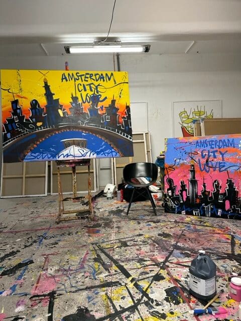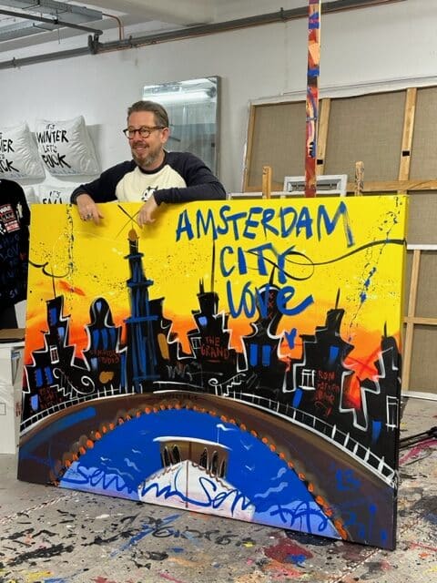 Origineel werk van Selwyn Senatori (2023) in prachtige kleuren. Het stuk is met gemengde technieken opgebouwd met een vlotte, vrije en trefzekere schilderstijl en het krachtige, dynamische kleurgebruik wat zo karakteristiek is voor Senatori’s werk. ‘Amsterdam City Love’ is vervaardigd op een dubbeldik opgespannen linnen doek waarvan de zijkanten door Selwyn zijn mee geschilderd.
