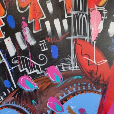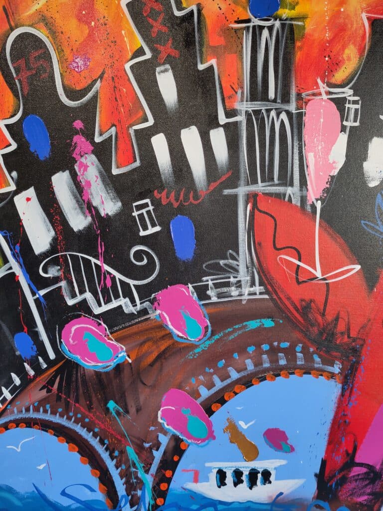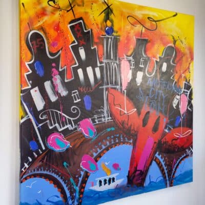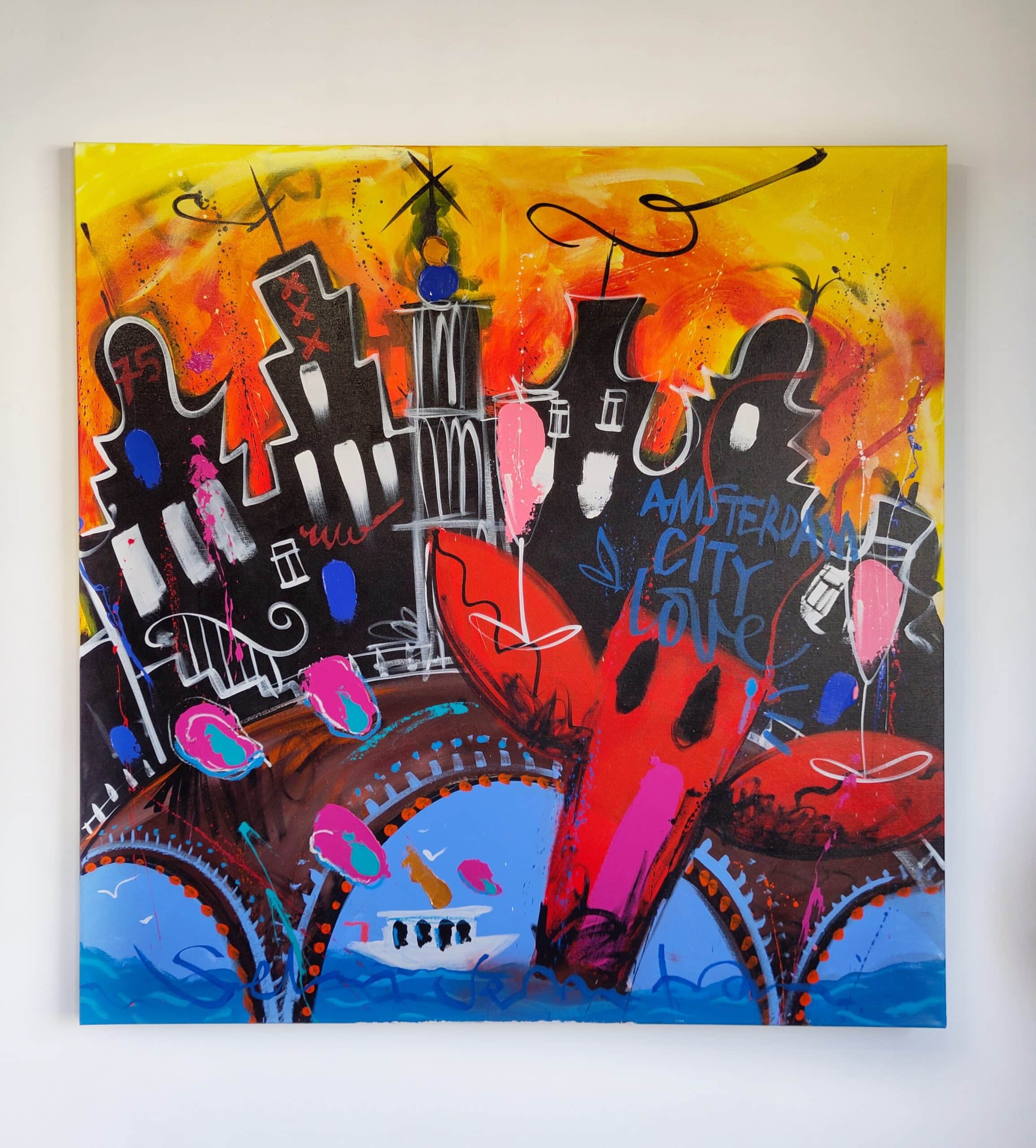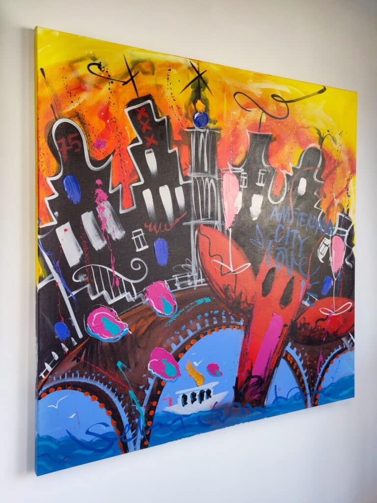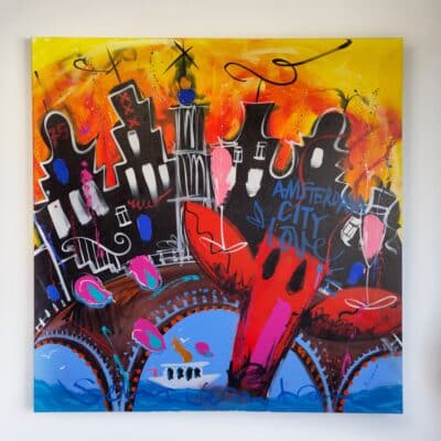 Origineel werk van Selwyn Senatori (2023) in prachtige kleuren. Het stuk is met gemengde technieken opgebouwd met een vlotte, vrije en trefzekere schilderstijl en het krachtige, dynamische kleurgebruik wat zo karakteristiek is voor Senatori’s werk. ‘Amsterdam City Love – Lobster’ is vervaardigd op een dubbeldik opgespannen linnen doek waarvan de zijkanten door Selwyn zijn mee geschilderd.