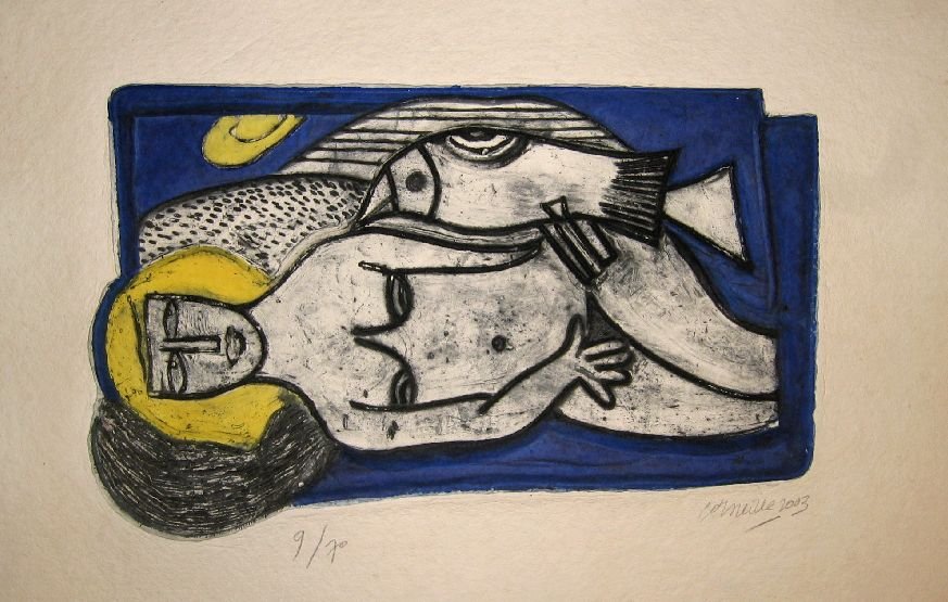 Zeer exclusieve aquagravure van Corneille getiteld Aquamarine uit 2003. De aquagravure is een zeldzaam gebruikte (zeef)druk techniek waarbij zwaar hangeschept papier als het nat is in een relïef wordt geperst. Daarna wordt het kunstwerk met de hand ingeschilderd! Zeer bewerkelijke techniek en dus zelden toegepast. Het werk is in een bijzonder beperkte oplage van slechts 70 stuks geproduceerd en is op een hele bijzondere manier in een fraaie handgemaakte lijst ingelijst!
