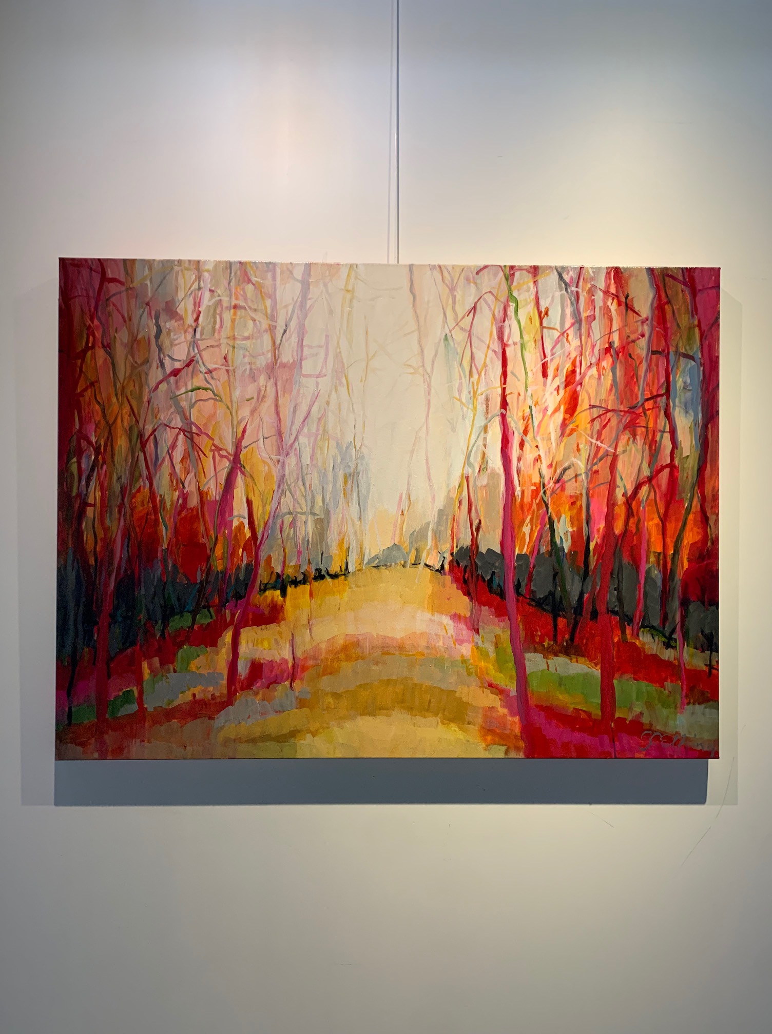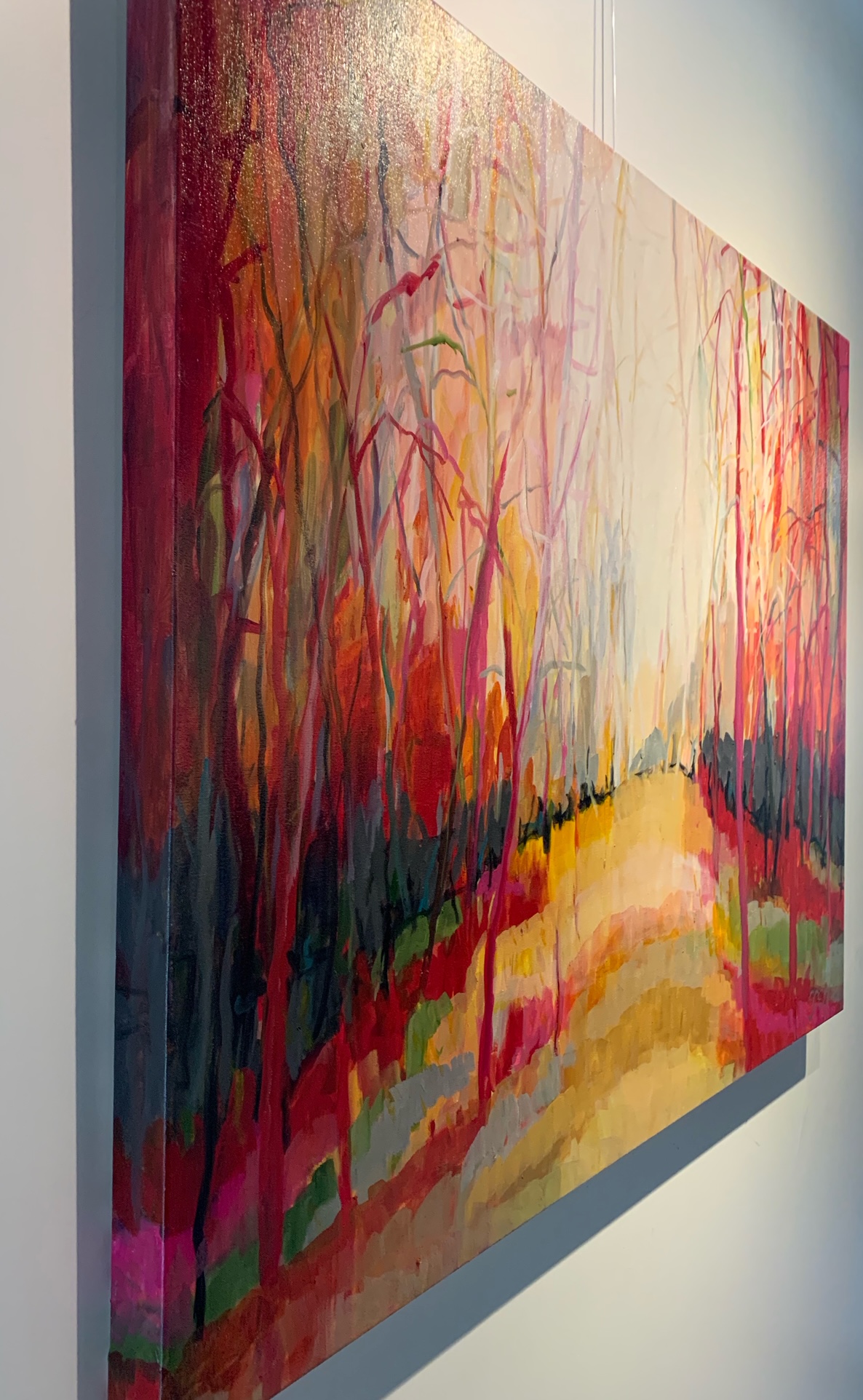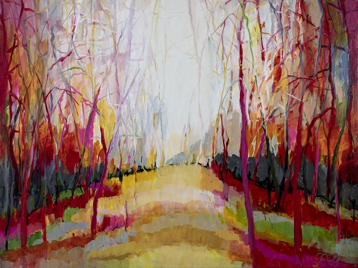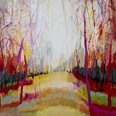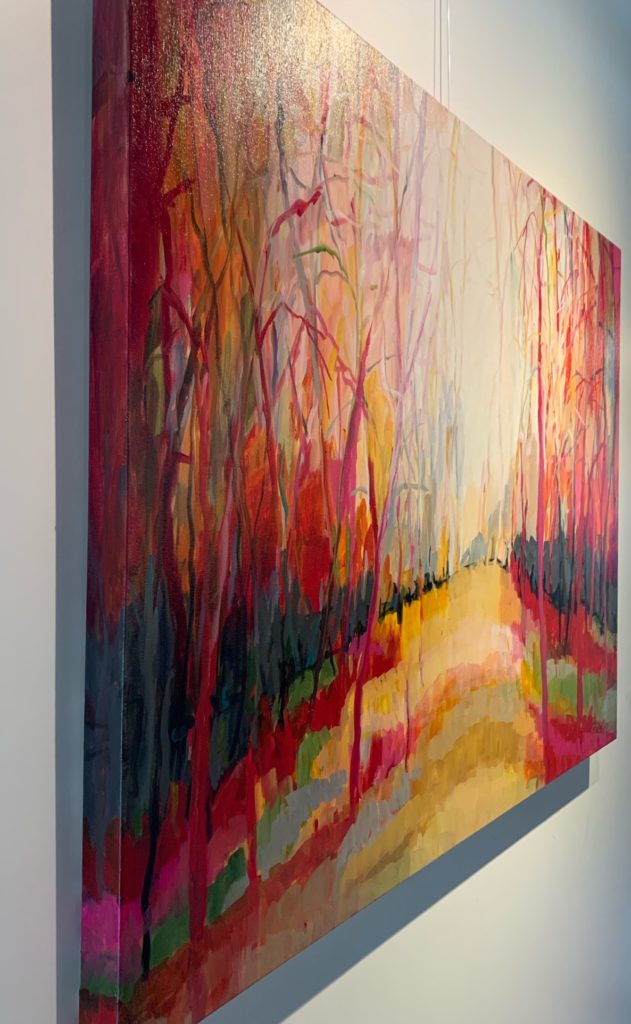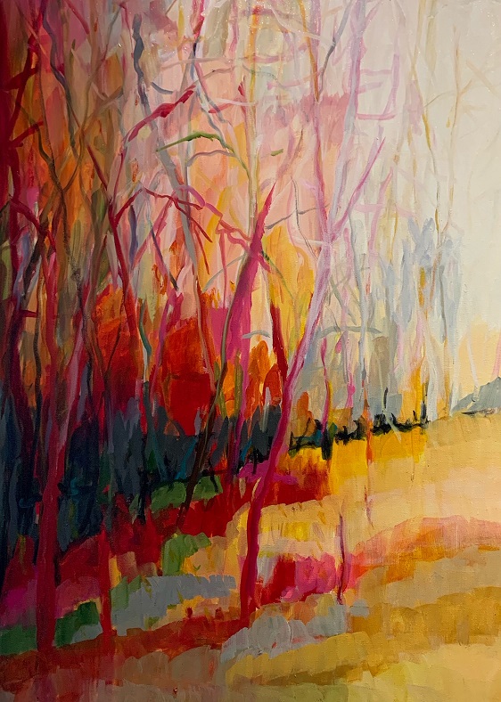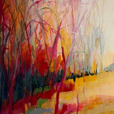 Een mooi origineel werk van Gerda Elfring uit 2019. Met ferme kwaststreken, een sterke penseelvoering en sprekende kleuren zet de kunstenares haar onderwerpen krachtig op het doek. Zij vertaalt het landschap in lyrisch-abstracte werken. Datgene wat haar boeit komt in grote kleurvlakken en nauwelijks gedetailleerde onderdelen op haar doeken, waarin emotie van de beleving belangrijker is dan de exacte weergave van het onderwerp.