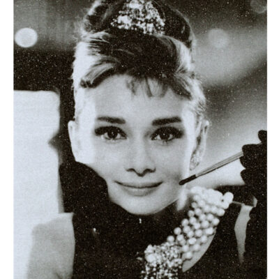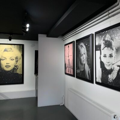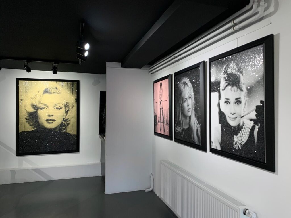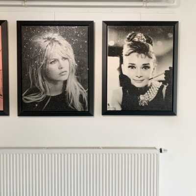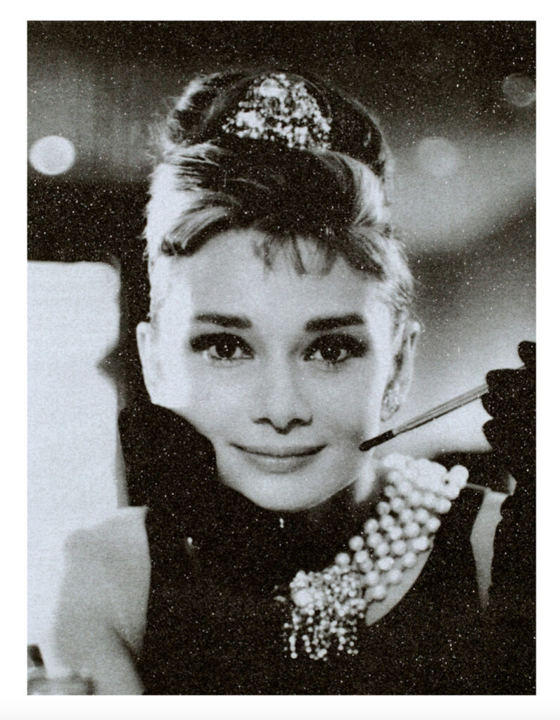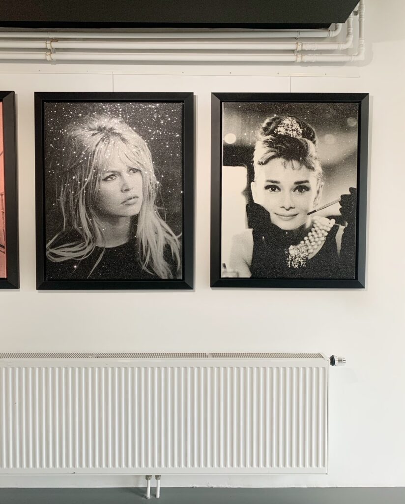 Bijzondere zeefdruk op linnen door de Amerikaanse kunstenaar Russell Young. Het werk is afgewerkt met diamond dust in de kleur New York White.
