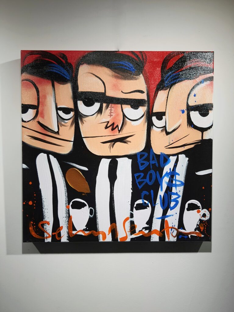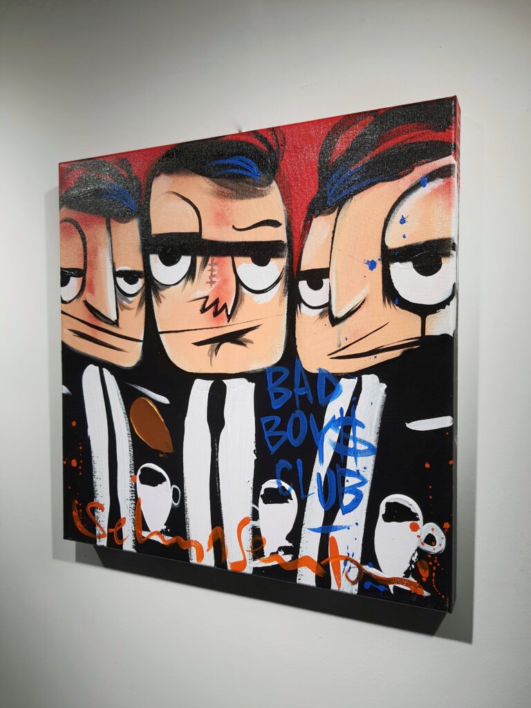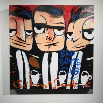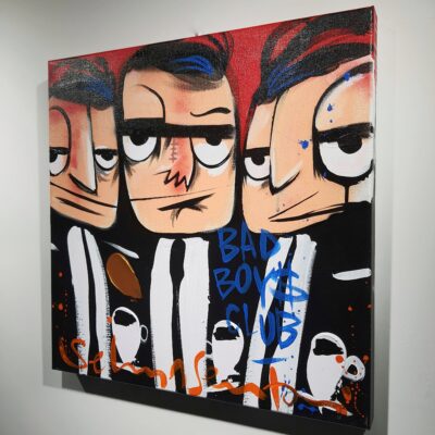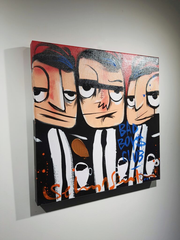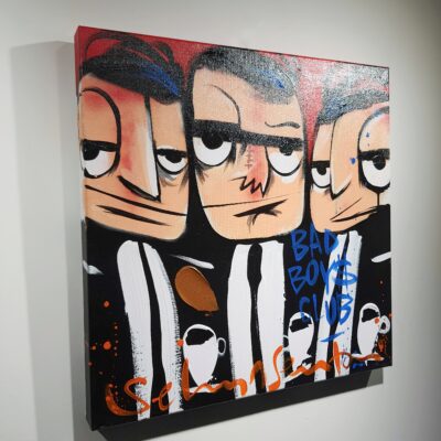 Origineel werk van Selwyn Senatori (2020) in prachtige kleuren. Het stuk is met gemengde technieken opgebouwd met een vlotte, vrije en trefzekere schilderstijl en het krachtige, dynamische kleurgebruik wat zo karakteristiek is voor Senatori’s werk. ‘Bad Boys Club’ is vervaardigd op een dubbeldik opgespannen linnen doek waarvan de zijkanten door Selwyn zijn mee geschilderd.