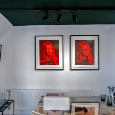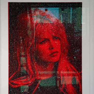 Bijzondere zeefdruk op papier door de Amerikaanse kunstenaar Russell Young. Het werk is afgewerkt in de kleuren rood en zwart en een finish van glinsterende diamond dust.