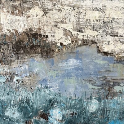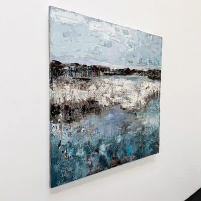 Oil on canvas, richly applied with palette knife and layered brushstrokes. Philippens shapes a tranquil landscape in cool blues, whites and earthy tones. The horizon and water subtly emerge between abstraction and suggestion. The thick paint texture adds depth and character, bringing calm, space and refinement.