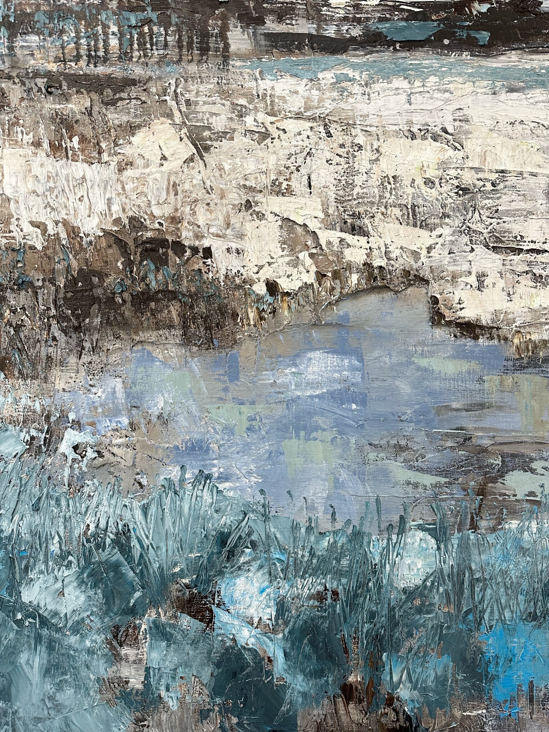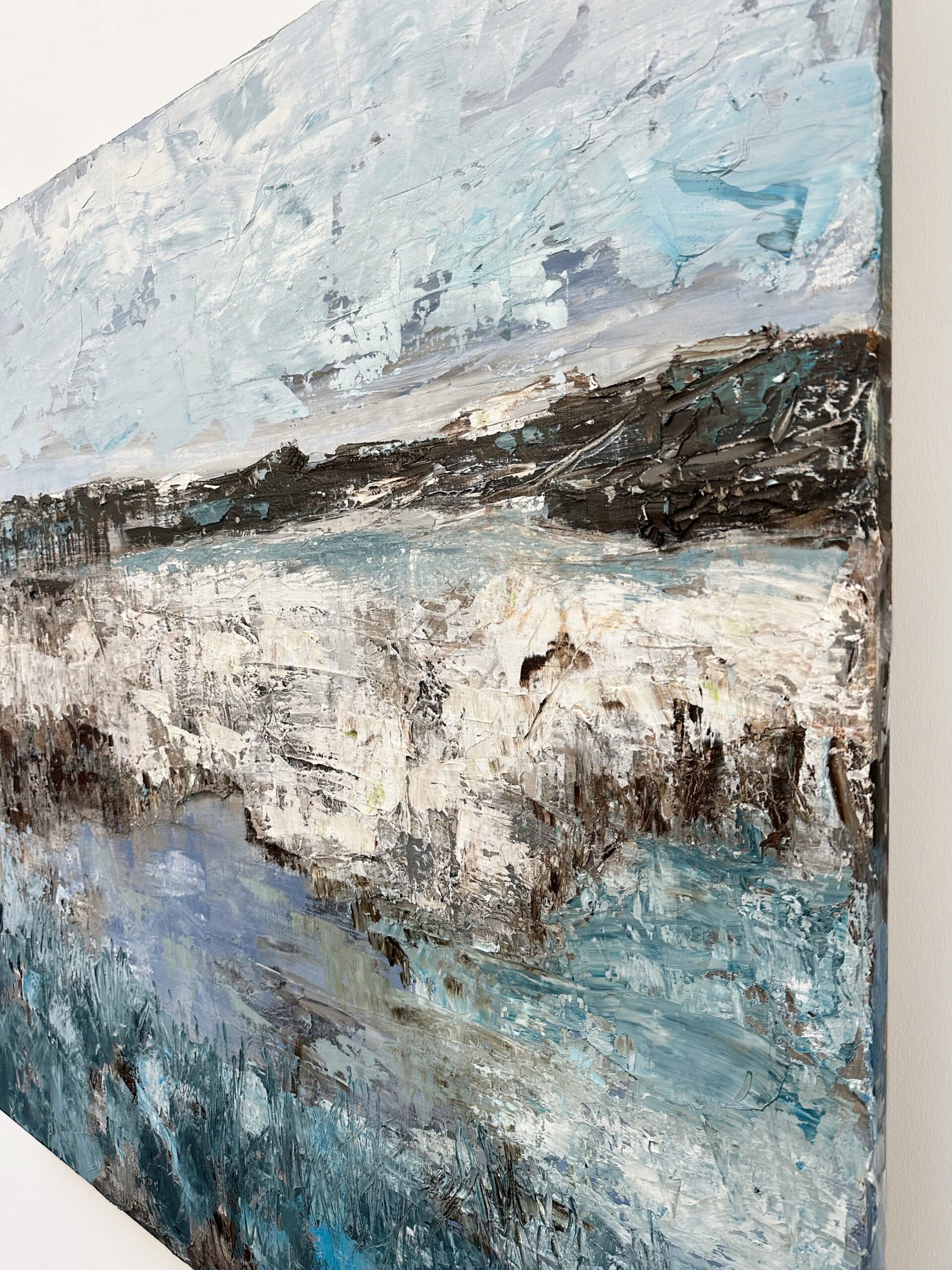 Oil on canvas, richly applied with palette knife and layered brushstrokes. Philippens shapes a tranquil landscape in cool blues, whites and earthy tones. The horizon and water subtly emerge between abstraction and suggestion. The thick paint texture adds depth and character, bringing calm, space and refinement.