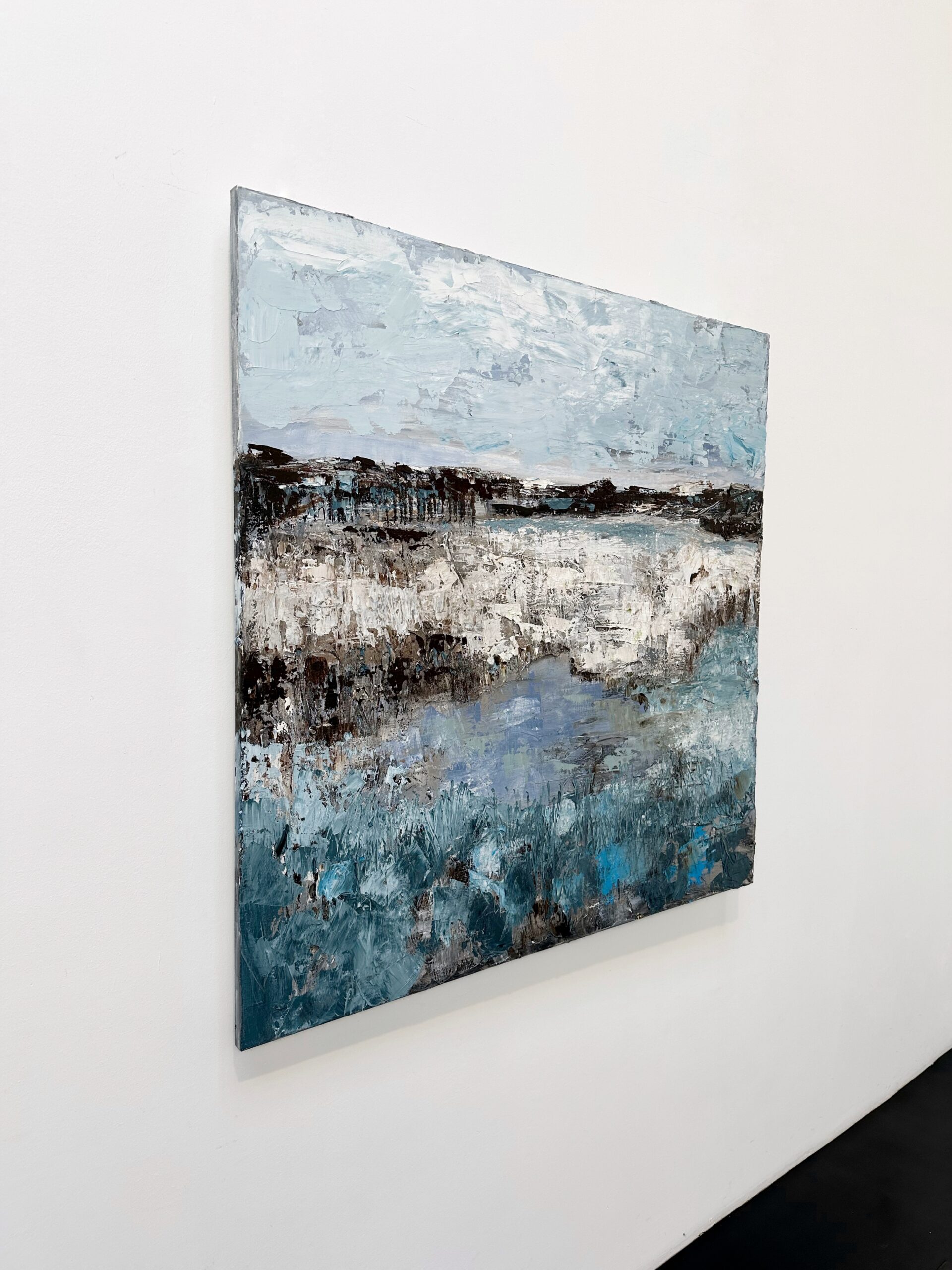 Olieverf op linnen, rijk aangebracht met paletmes en gelaagde penseelstreken. Philippens creëert een verstild landschap in koele blauwtinten, wit en aardse accenten. De horizon en het water lichten subtiel op tussen abstractie en herkenning. De volle verfstructuur geeft het werk diepte en karakter en brengt rust, ruimte en verfijning.