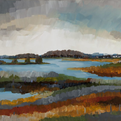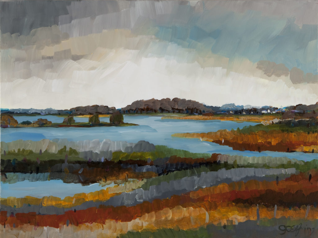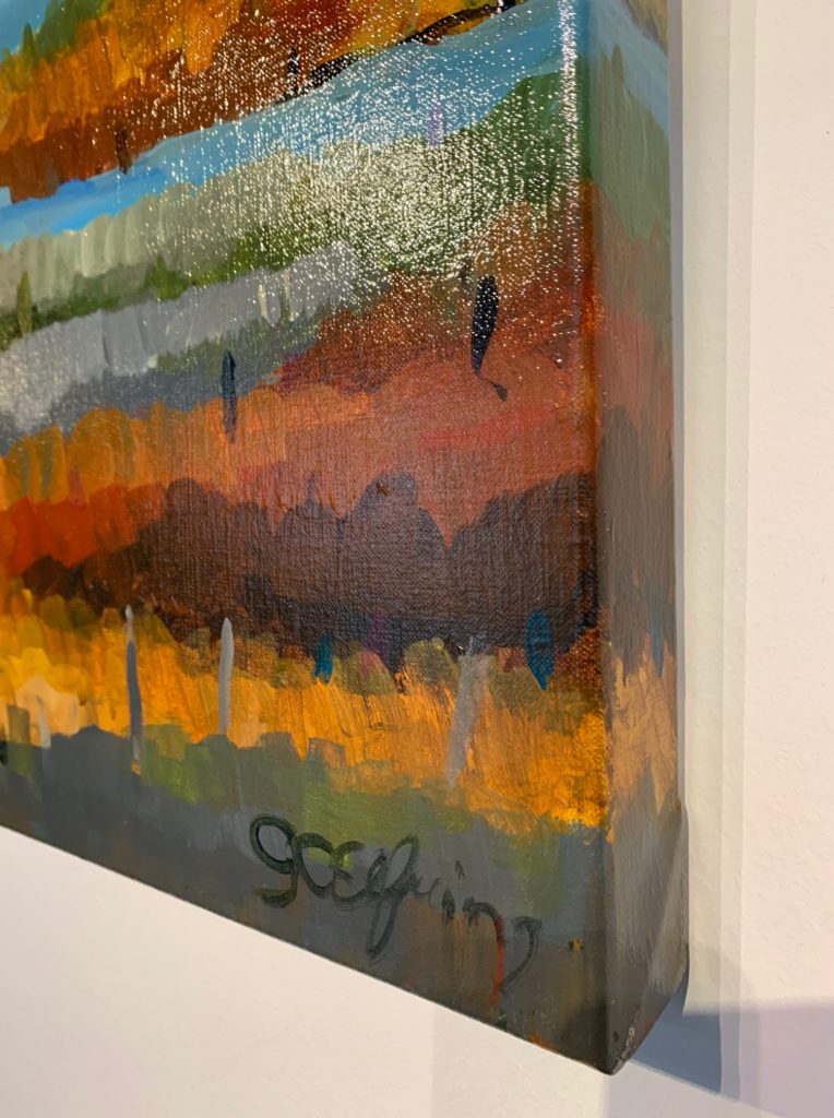 Een mooi origineel werk van Gerda Elfring uit 2012. Met ferme kwaststreken, een sterke penseelvoering en sprekende kleuren zet de kunstenares haar onderwerpen krachtig op het doek. Zij vertaalt het landschap in lyrisch-abstracte werken. Datgene wat haar boeit komt in grote kleurvlakken en nauwelijks gedetailleerde onderdelen op haar doeken, waarin emotie van de beleving belangrijker is dan de exacte weergave van het onderwerp.