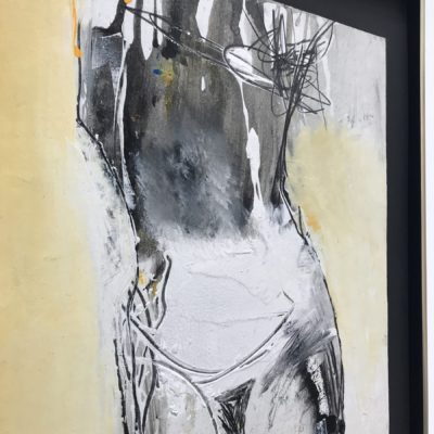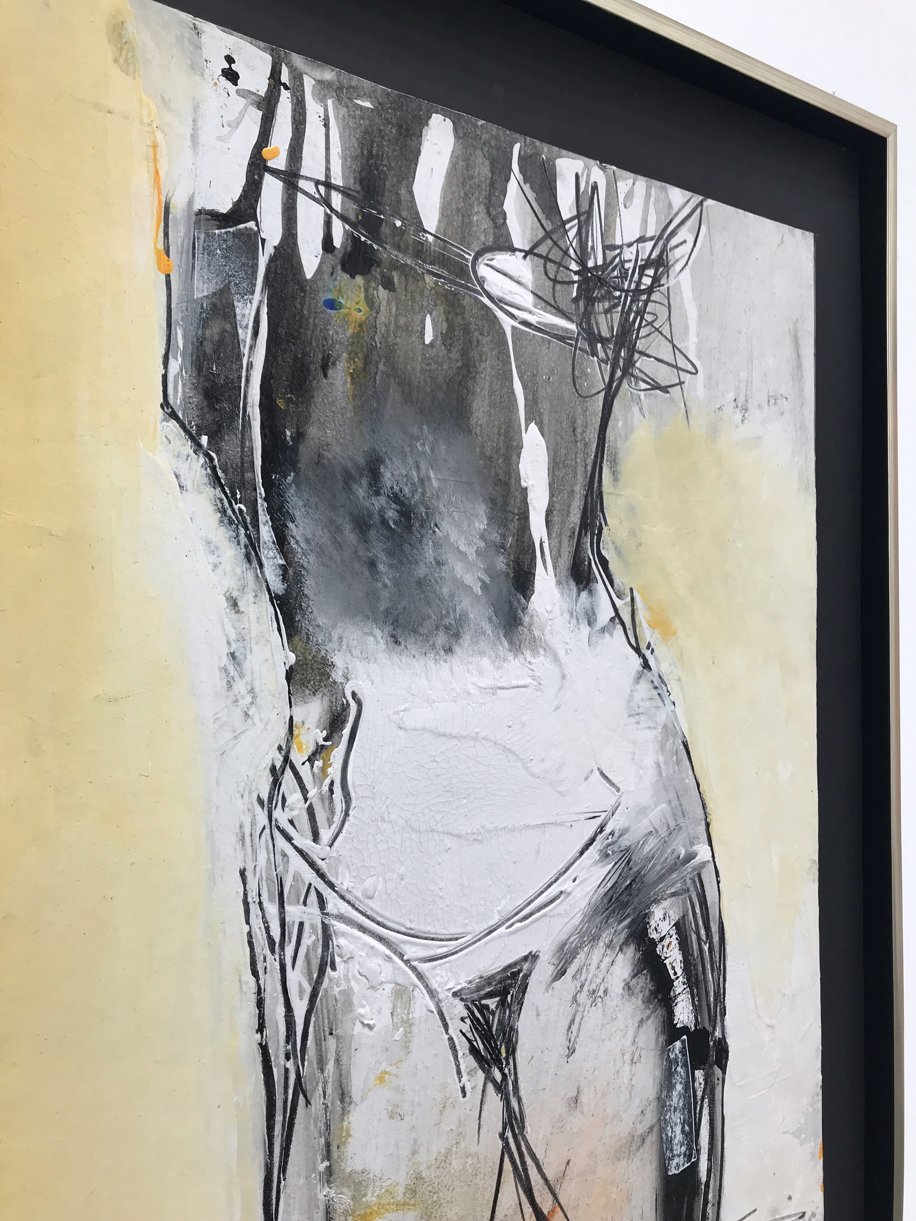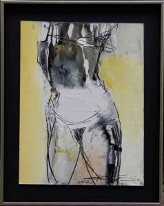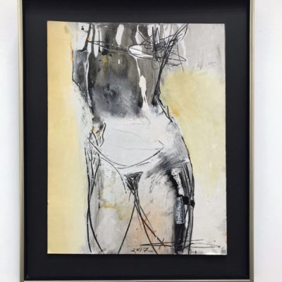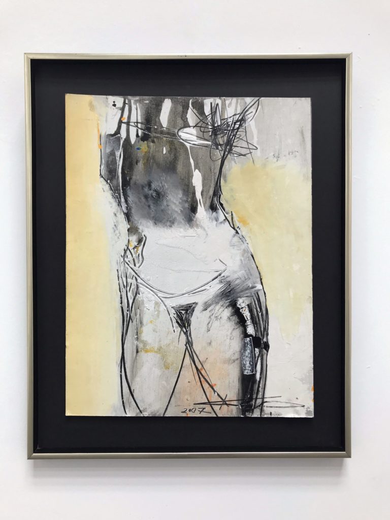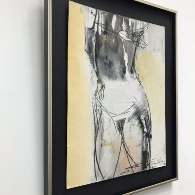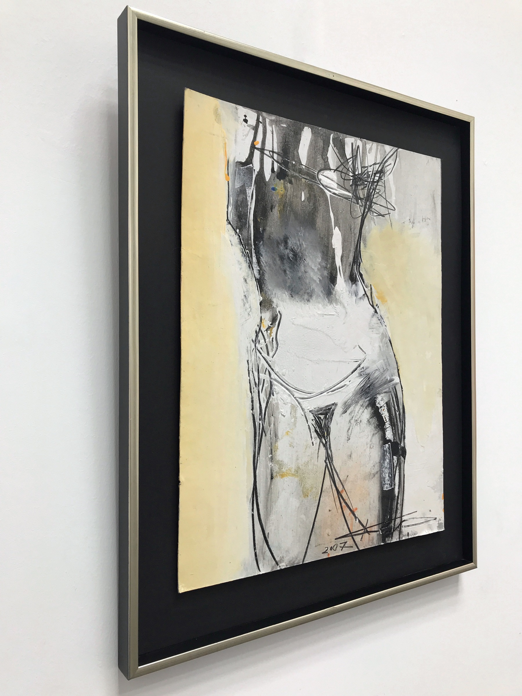 1 van 2 fraai originele werken op kartonpapier die Kantcho Kanev eind 2007 vervaardigde. De werken kennen een prachtige mix van gemengde technieken met een schets-achtige figuratie wat de stukken bijzonder veel kracht en dynamiek geeft. De stukken zijn door de kunstenaar op dik kartonpapier vervaardigd en daarna op een paneeltje verwerkt en fraai ingelijst in een subtiele bijpassende zilverkleurige baklijst.