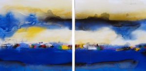 Prachtig groot 2-luik op linnen van Theo Koster uit 2008! Fraaie heldere en krachtige kleuren, dik verf gebruik, verschillende materialen en collages.. de combinatie van technieken die Theo Koster in zijn originele werken toepast zorgen voor een prachtig spannend schouwspel. Door de subtiele details en de diepte in de stukken van Theo Koster raak je als toeschouwer niet snel uitgekeken.