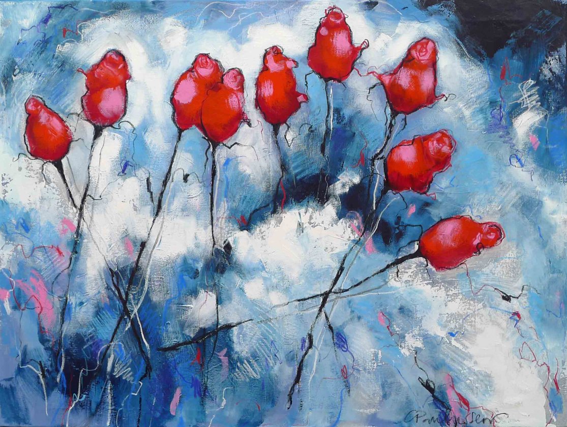 Mooi werk van Carolina Paulussen vervaardigd in de zomer van 2012. Het stuk is door de kunstenares met gemengde technieken op een stevige linnen doek opgezet en kent een prachtige dynamiek en een intrigerend spel van gelaagdheid, subtiele figuratie en kleurgebruik