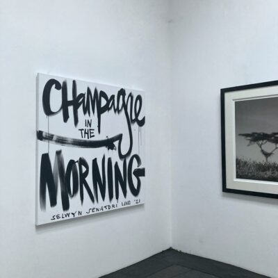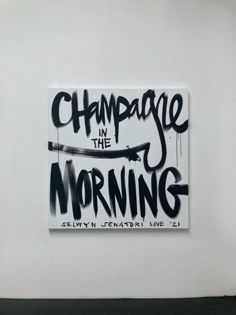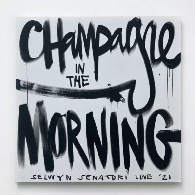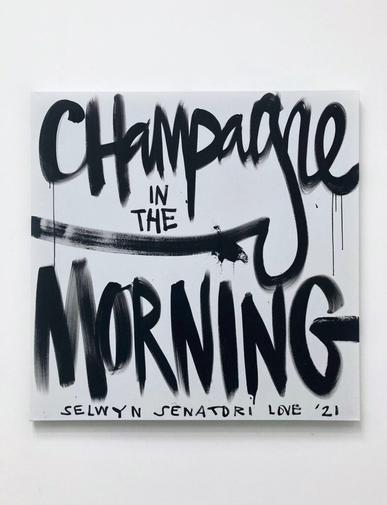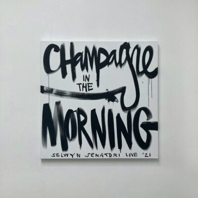 Origineel werk op linnen door Selwyn Senatori. Het stuk kenmerkt zich door een dynamische mix van technieken en kleuren die van het doek af lijken te spatten. ‘Champagne in the morning’ is een bekende leus van Selwyn die zijn levensstijl weergeeft. Een levenswijze vol van rock ’n roll, non-conformisme en kunst. Het schilderij is opgespannen op een houten frame en de zijkanten zijn mee geschilderd.