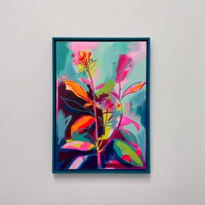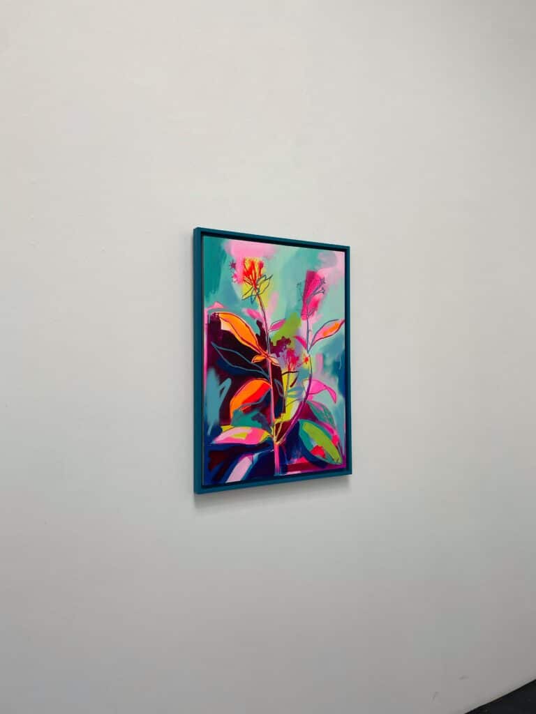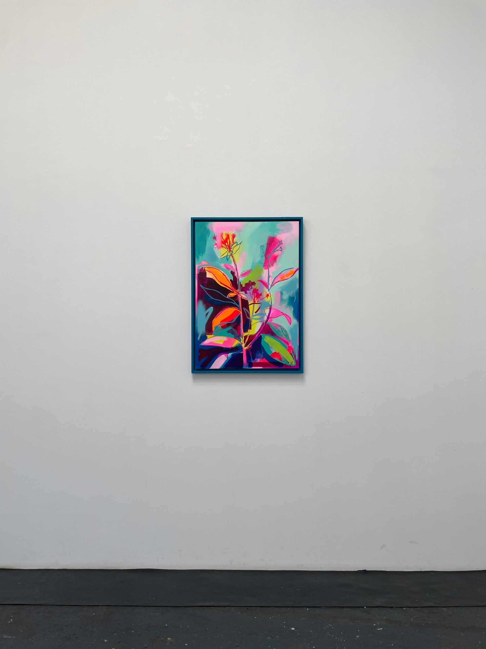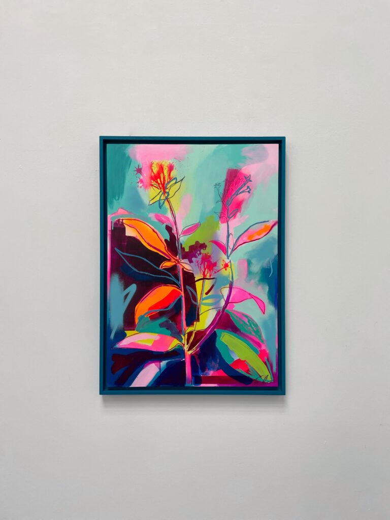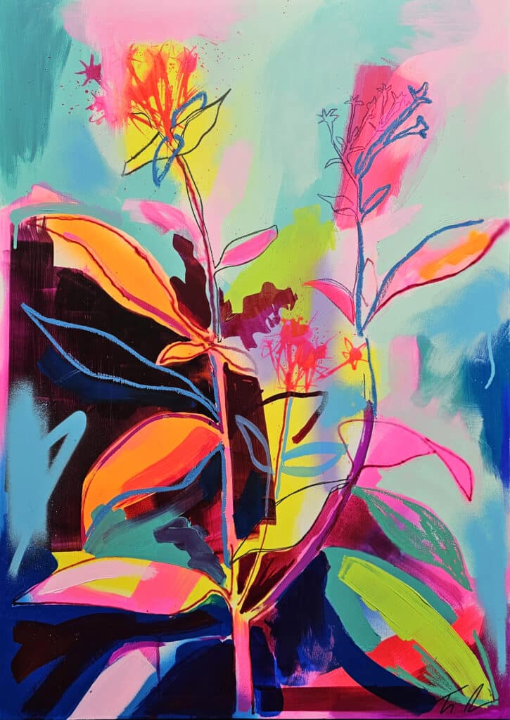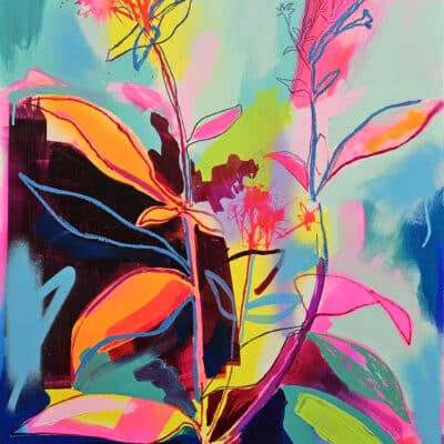 Fowler takes inspiration from exotic and migratory plants reflecting his own DNA, from west Africa, via the Caribbean to the UK. He subverts traditional and contemporary methods of applying oil, acrylic, spray, enamel and graffiti inks using brushes, different aperture caps and marker paint mops to orchestrate purposeful marks, strokes, drips, scrapes and smears across the canvas whilst constructing his exciting and dynamic artworks.