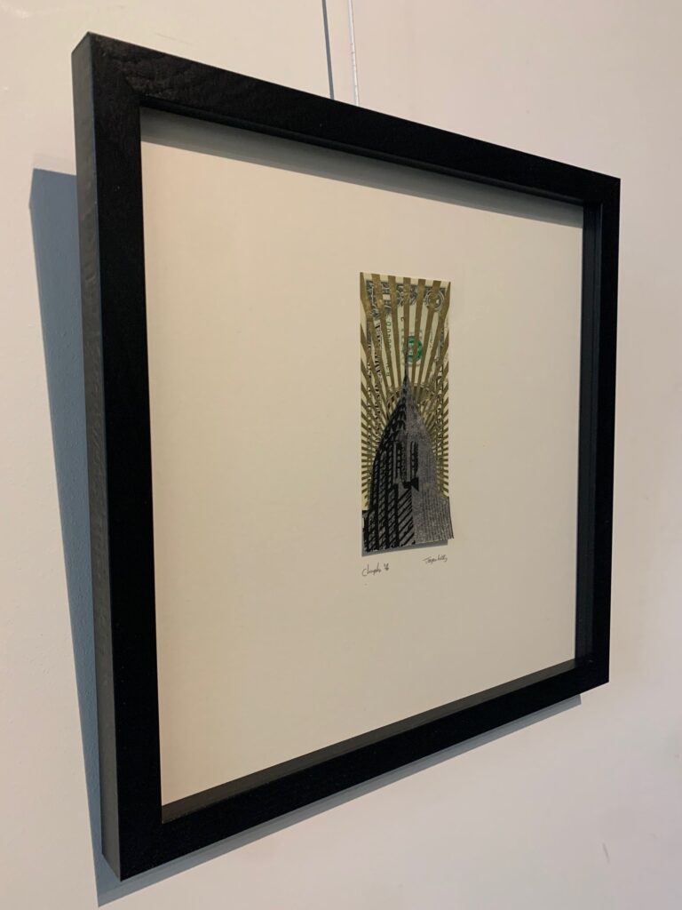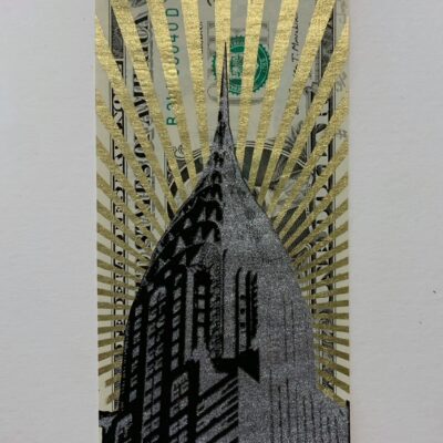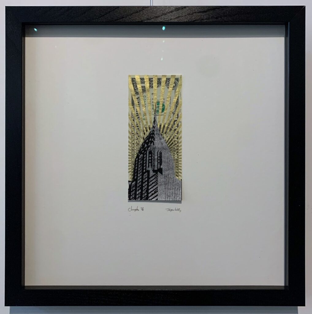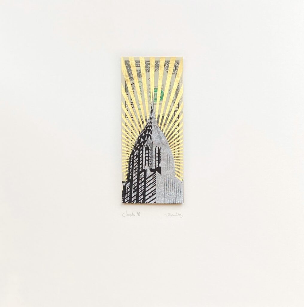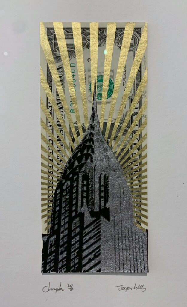 Het werk van de hedendaagse kunstenaar Jayson Lilley (1972) staat bekend om zijn stadse en architectonische focus, waarbij hij de nadruk legt op bekende stadsgezichten van onder andere New York, in dit geval van de het Chrysler Building. Hij combineert een unieke zeefdruktechniek met schilderkunst en collagetechnieken, resulterend in bruisende scenes die versterkt worden door het gebruik van bijzondere kleuren en bladgoud of -koper.
