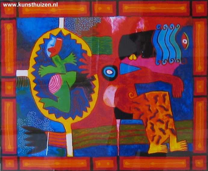 Fraaie zeefdruk van Clemens Briels uit 2005. De zeefdruk is door de kunstenaar vervaardigd ter gelegenheid van het Liliane Fonds. Tijdens het jaarlijkse gala zijn zowel het originele doek “El Tentador” als de zeefdrukken geveild en de volledige opbrengst is door de kunstenaar beschikbaar geschonken aan het Liliane fonds! Niet alleen haalt u met deze zeefdruk dus een prachtig kunstwerk in huis, indirect steunt u er ook een goed doel mee! De zeefdruk is ingelijst in een mooie, bijpassende, handgemaakte zilverkleurige lijst.