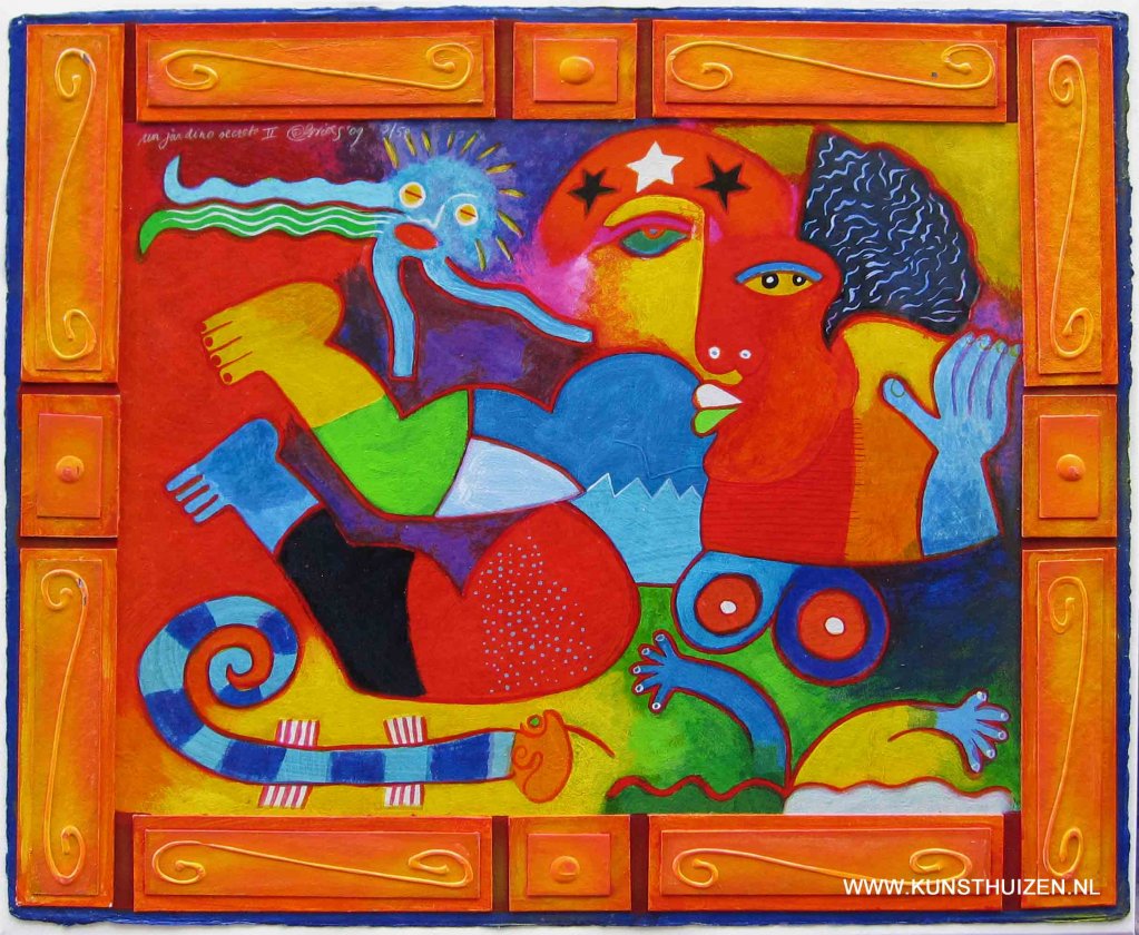 Fraai werk van Clemens Briels. Maakte deze bijzondere Nederlandse kunstenaar eerder al een reproductie met de terragravure- en de aquagravuretechniek, nu heeft hij twee reproducties vervaardigd waarbij hij gebruik heeft gemaakt van de lastige maar uitzonderlijk mooie carborundum-litho techniek! De carborundum-litho is een combinatie van steendruk en reliëfdruk op zeer dik handgeschept papier en, mits goed uitgevoerd, heeft een carborundumlitho een prachtige diepe kleuren en reliëf-accenten. Clemens Briels laat met “El rei de los mares” en “Juan el Pescador” zien dat hij ook deze techniek zeer goed beheerst, het werk heeft de kracht en uitstraling die we van de kunstenaar gewend zijn. Het werk is ingelijst in een mooie bijpassende handgemaakte zilverkleurige lijst voorzien van een zwevend passepartout.