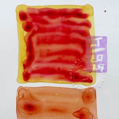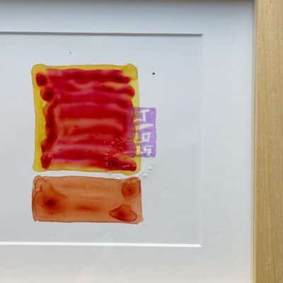Two warm-toned blocks in red and orange form a playful, balanced composition. Transparent inks flow organically, with subtle purple and yellow accents adding visual depth. This original miniature blends abstraction and simplicity, a refined eye-catcher with a graphic edge.