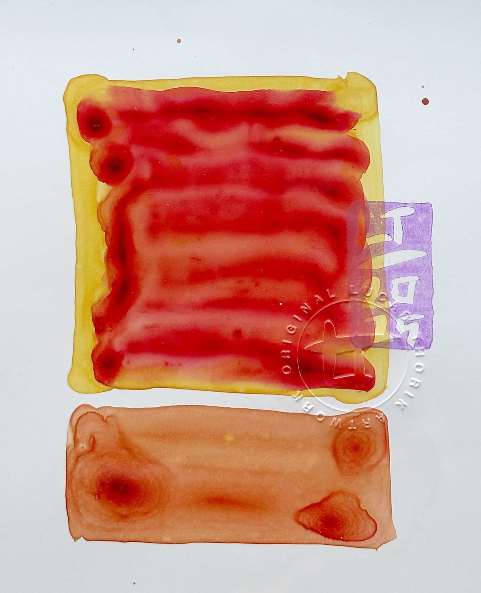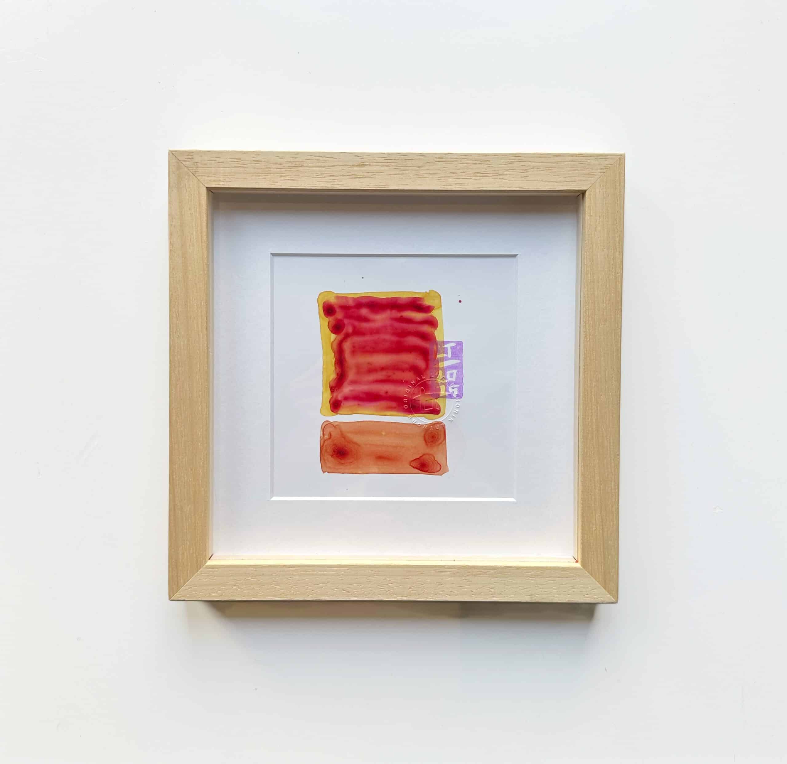 Two warm-toned blocks in red and orange form a playful, balanced composition. Transparent inks flow organically, with subtle purple and yellow accents adding visual depth. This original miniature blends abstraction and simplicity, a refined eye-catcher with a graphic edge.