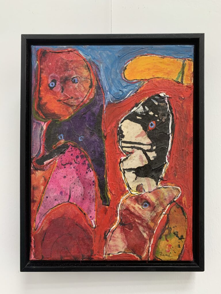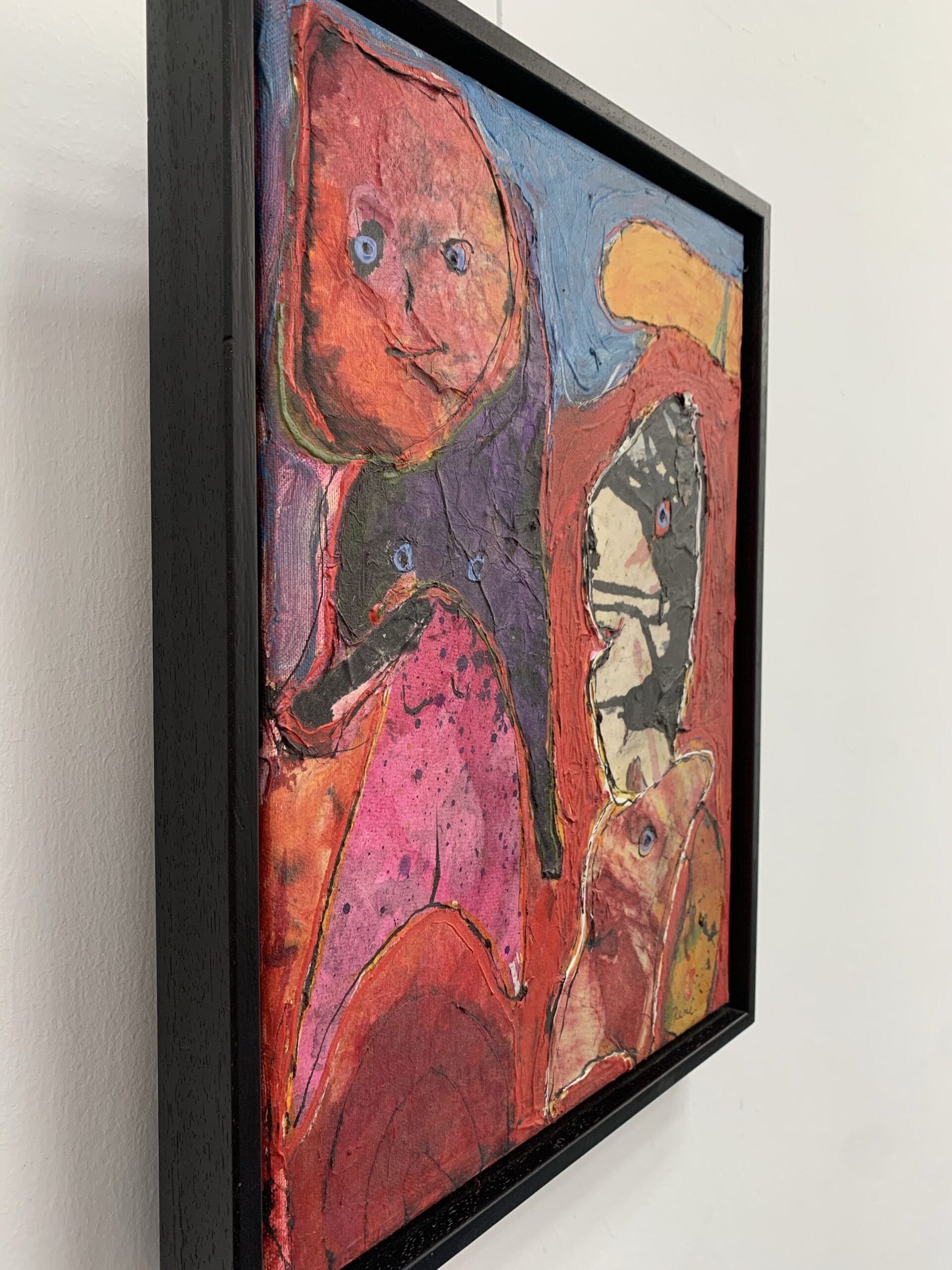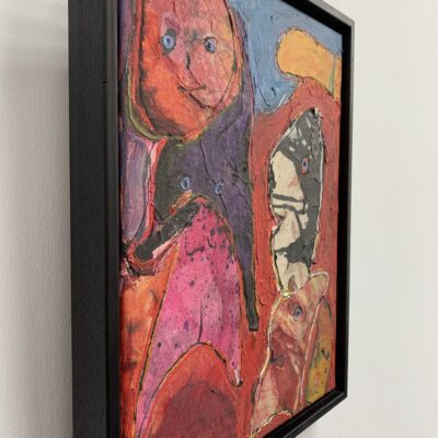 Fraai kleurgebruik en wederom een prachtige combinatie van technieken! De schilderijen zijn ingelijst in zwartkleurige baklijsten en achterop nogmaals gesigneerd en getiteld.