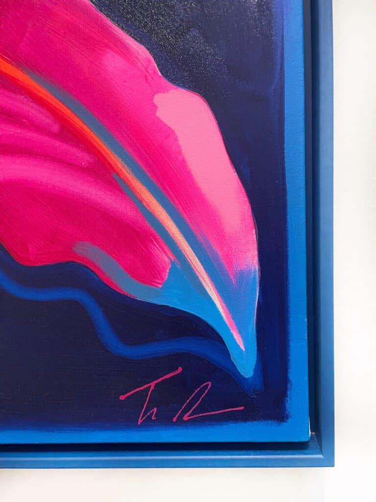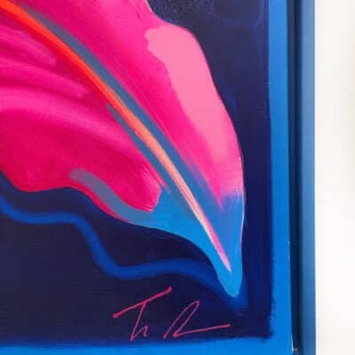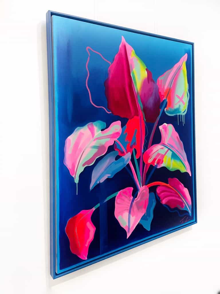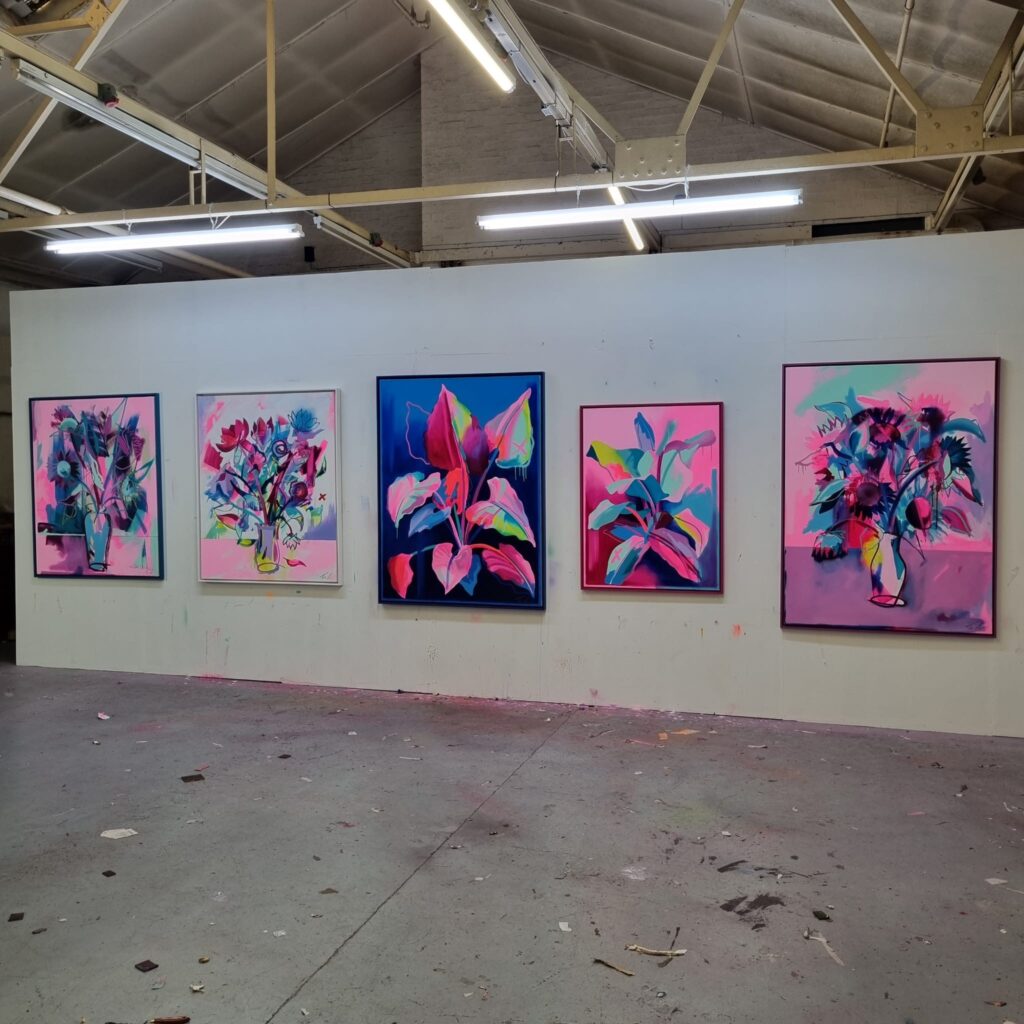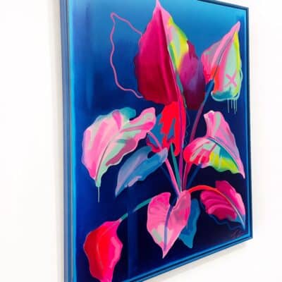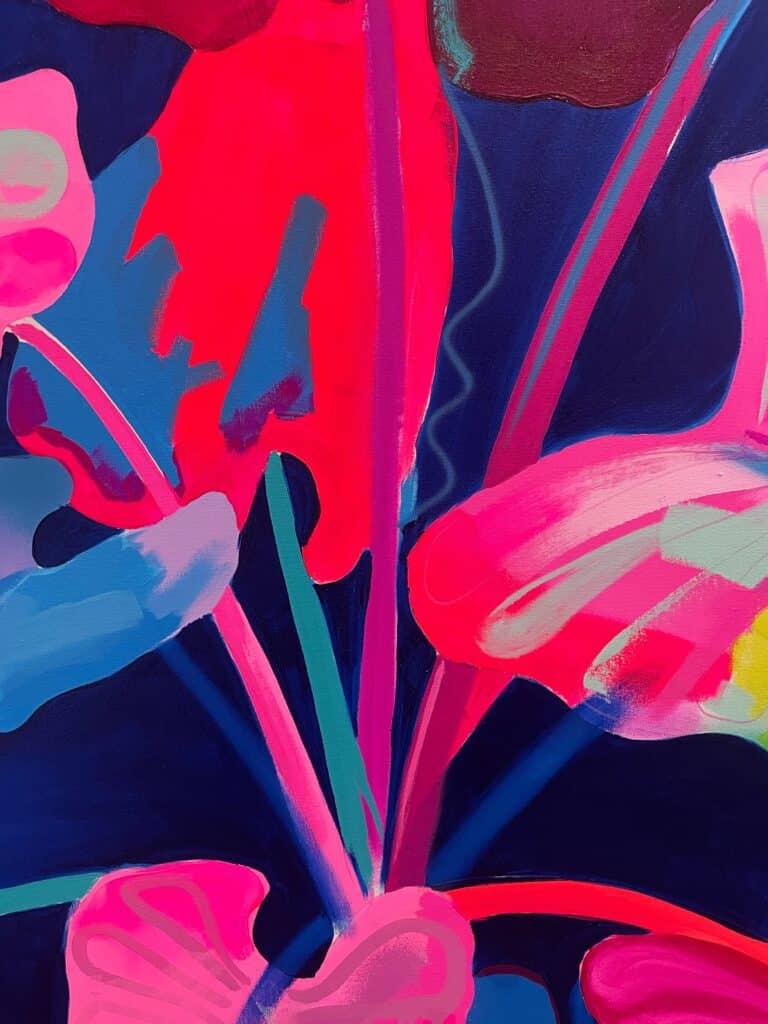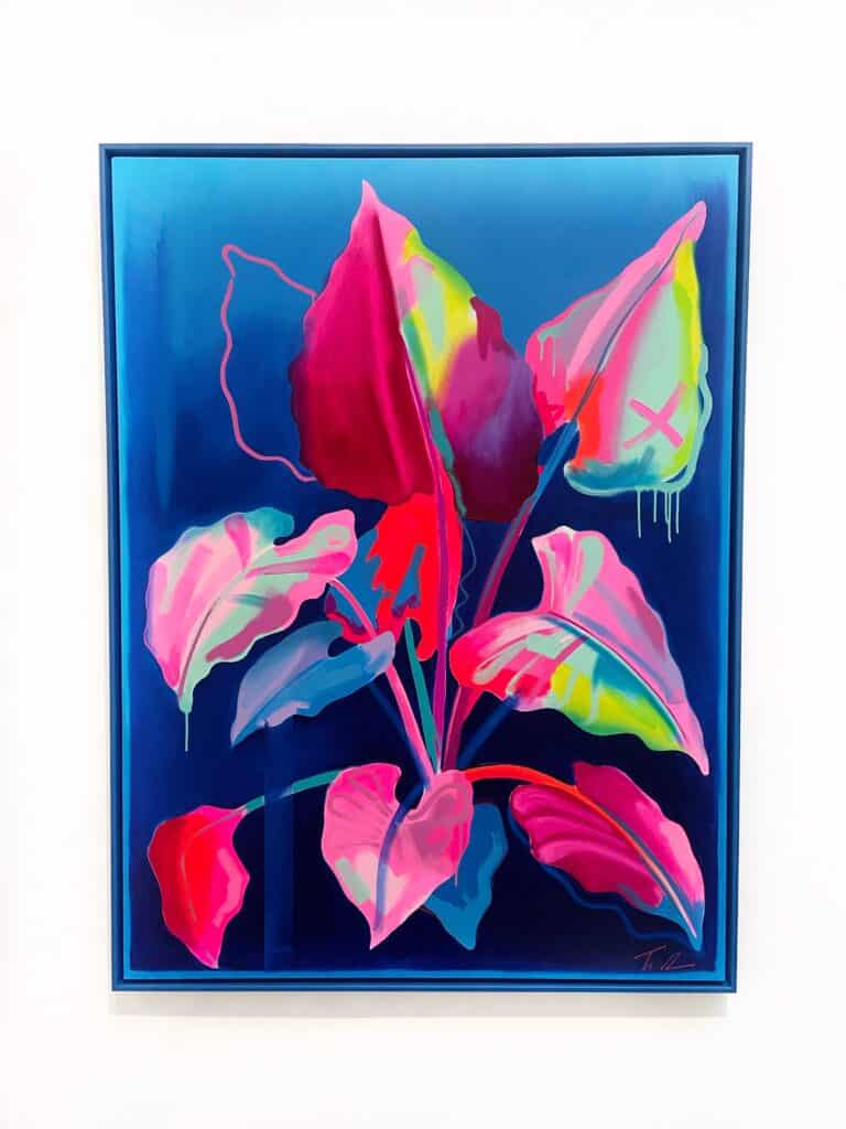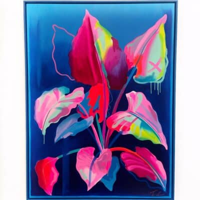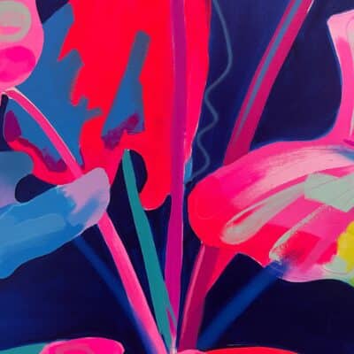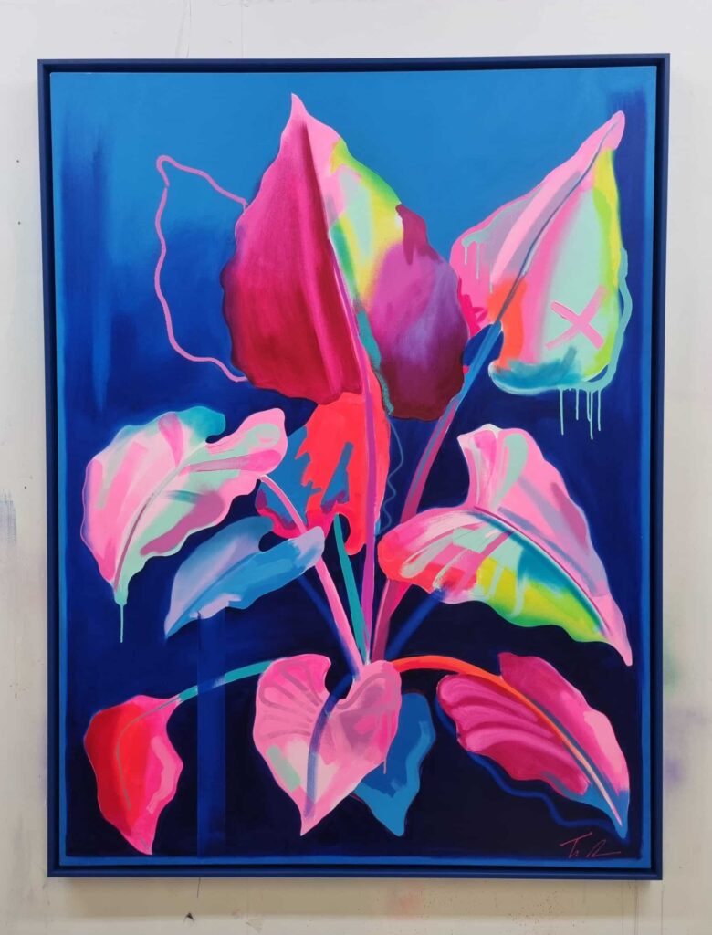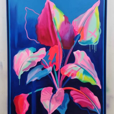 Fowler takes inspiration from exotic and migratory plants reflecting his own DNA, from west Africa, via the Caribbean to the UK. He subverts traditional and contemporary methods of applying oil, acrylic, spray, enamel and graffiti inks using brushes, different aperture caps and marker paint mops to orchestrate purposeful marks, strokes, drips, scrapes and smears across the canvas whilst constructing his exciting and dynamic artworks.