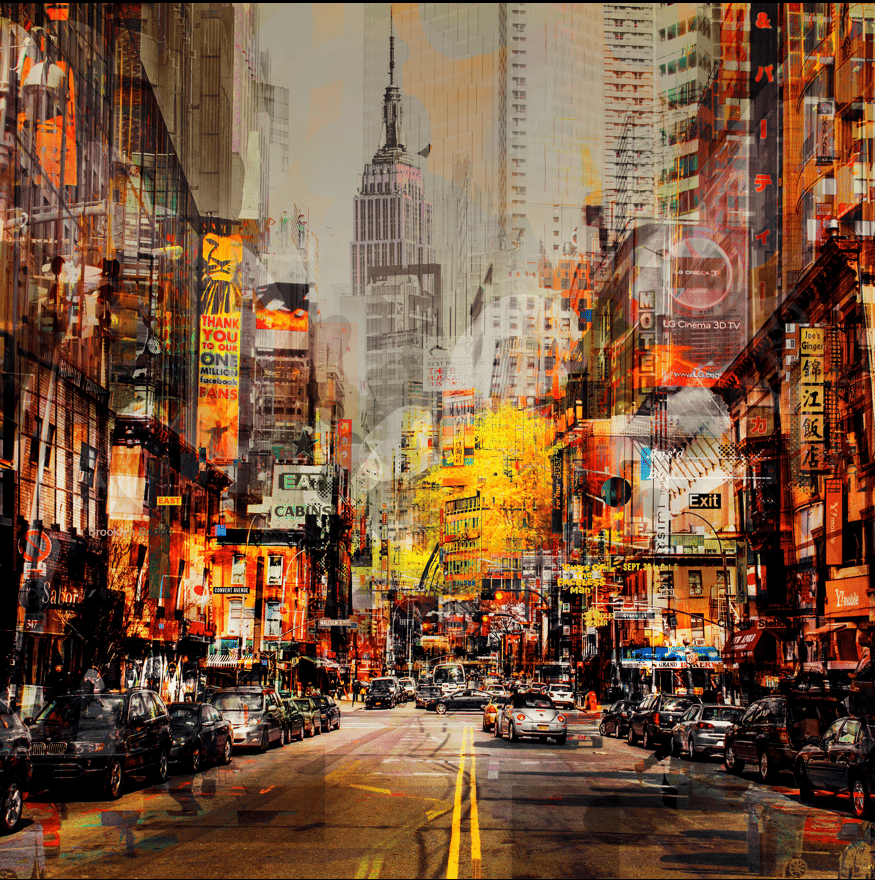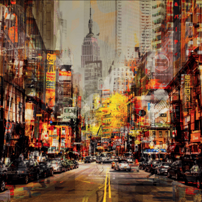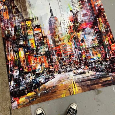 Paco fotografeert over de hele wereld stadsgezichten en combineert deze met affiches van muziek, typografie, erotica en cinema uit de jaren ’50, ’60 en ’70. De digitaal gemixte print wordt met de hand nabewerkt met stencils, sjablonen, verf en stift. Door het stedelijk leven van toen en nu in één beeld te verenigen, creëert hij een hedendaags schilderij. Veelzijdige, levendige, mixed media schilderkunst die onmiskenbaar herkenbaar is als een Paco Raphael.