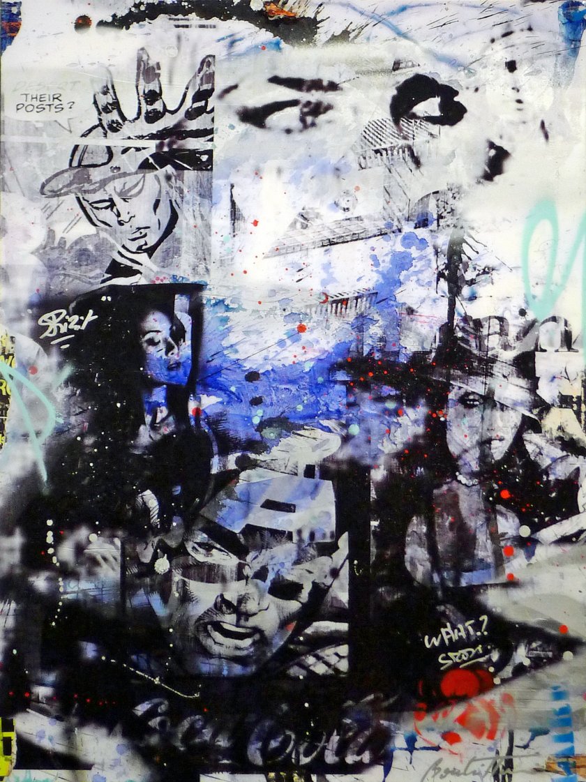 Prachtig expressief werk van de befaamde Franse Street-art kunstenaar Cedric Bouteiller. Bouteiller is een multi-media en multi-gediciplineerd kunstenaar. Zijn werk bestaat uit een unieke samensmelting van technieken: hedendaagse fotografie, schilderkunst, graffiti, digitale manipulatie en collages. Zijn werk kent een ongeëvenaarde diepte in gelaagdheid en een energie waarbij de toeschouwer keer op keer wordt verrast door nieuwe details en indrukken.