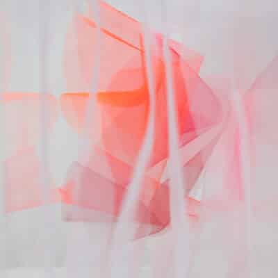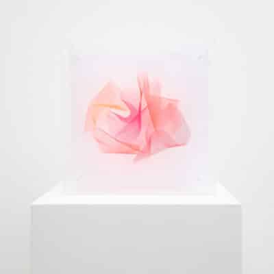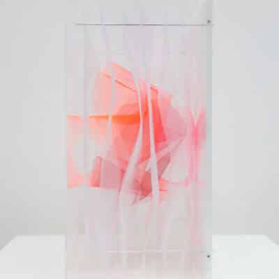 Transparant plexiglas vormt de omlijsting van dit intrigerende object, waarin lagen fijn, roze en oranje gaas een poëtische dans aangaan. Door de gelaagde constructie ontstaat een spel van licht, schaduw en beweging dat steeds verandert bij elke invalshoek. Het werk ademt luchtigheid en kwetsbare kracht, en voegt een subtiele maar expressieve esthetiek toe aan ieder interieur. Een sculptuur die rust én spanning in harmonie weet te vangen.