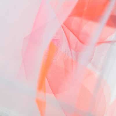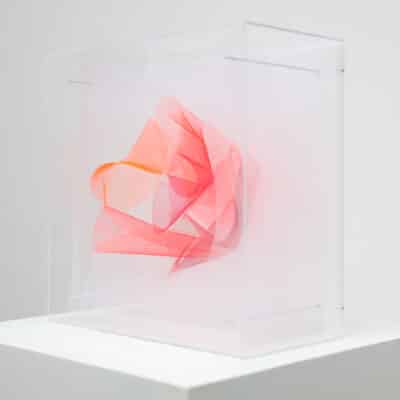 Transparent plexiglass frames this captivating object, where delicate layers of pink and orange mesh perform a poetic dance. The layered construction creates an ever-shifting play of light, shadow, and movement depending on the angle of view. The piece exudes both lightness and fragile strength, bringing a subtle yet expressive presence into any interior. A sculpture that harmoniously balances calm and tension.