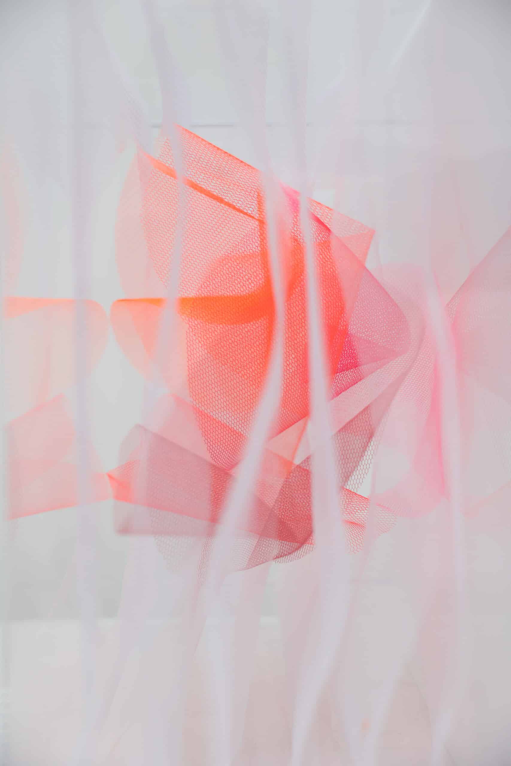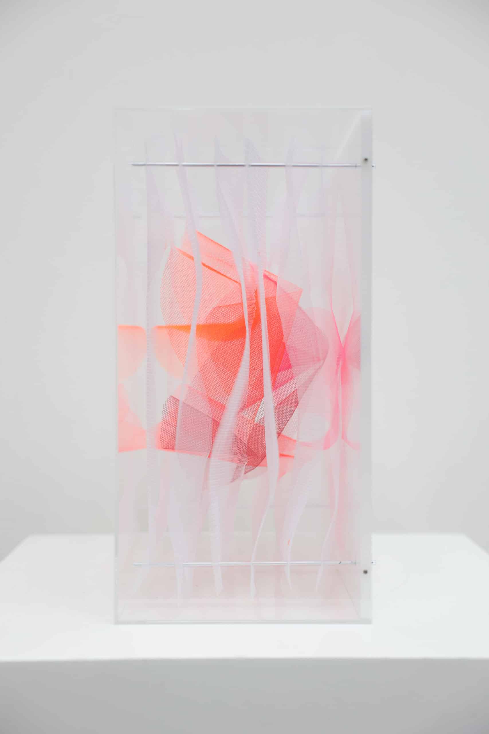 Transparant plexiglas vormt de omlijsting van dit intrigerende object, waarin lagen fijn, roze en oranje gaas een poëtische dans aangaan. Door de gelaagde constructie ontstaat een spel van licht, schaduw en beweging dat steeds verandert bij elke invalshoek. Het werk ademt luchtigheid en kwetsbare kracht, en voegt een subtiele maar expressieve esthetiek toe aan ieder interieur. Een sculptuur die rust én spanning in harmonie weet te vangen.