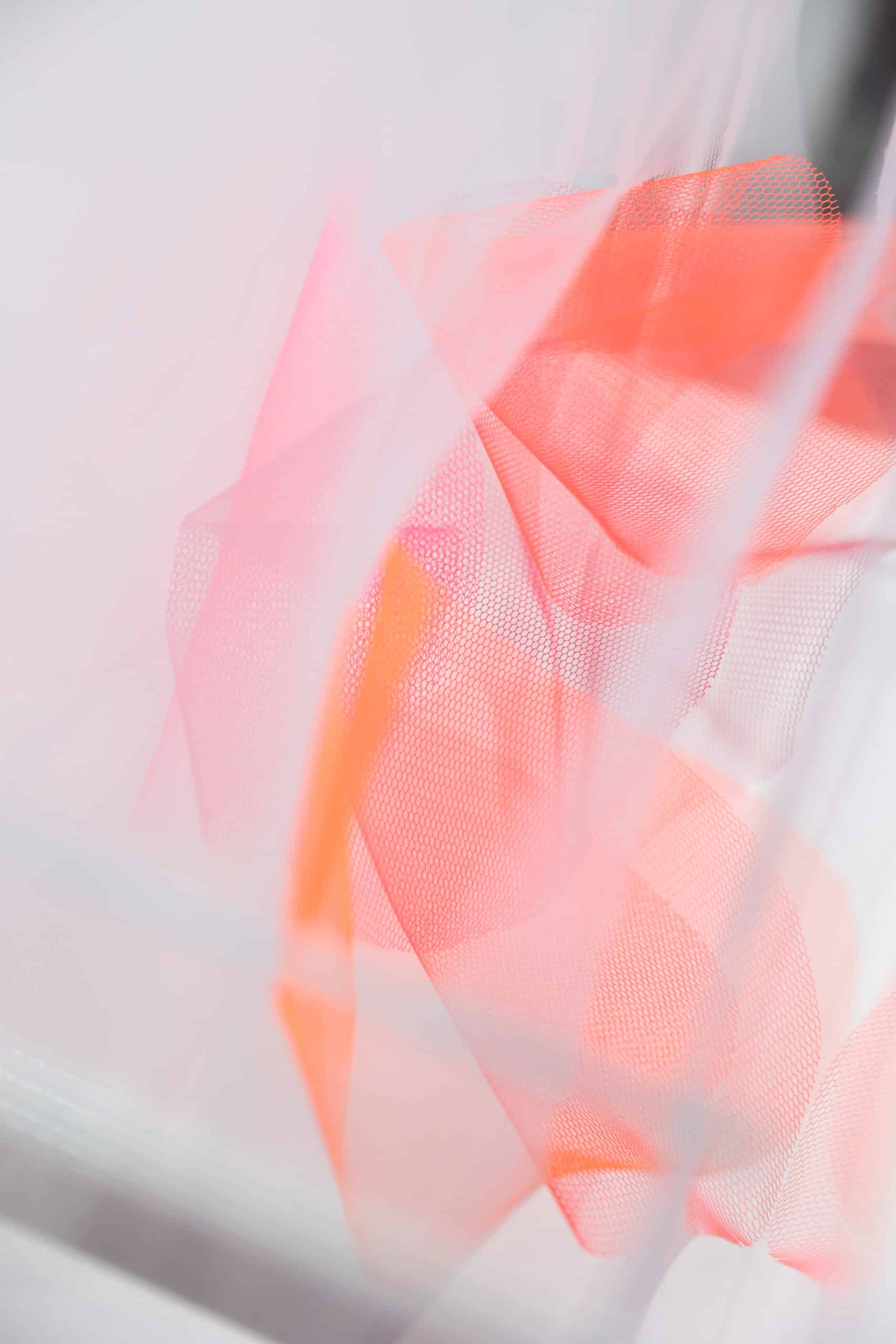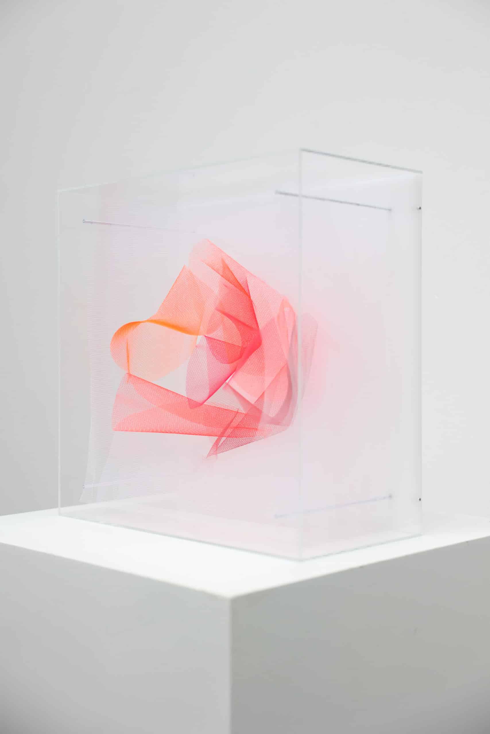 Transparent plexiglass frames this captivating object, where delicate layers of pink and orange mesh perform a poetic dance. The layered construction creates an ever-shifting play of light, shadow, and movement depending on the angle of view. The piece exudes both lightness and fragile strength, bringing a subtle yet expressive presence into any interior. A sculpture that harmoniously balances calm and tension.
