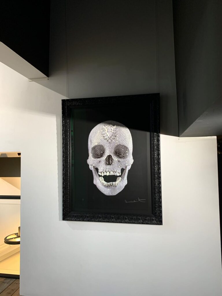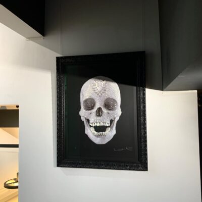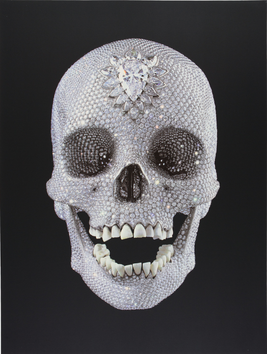 Deze zeefdruk is vervaardigd naar wellicht het meest bekende werk van Damien Hirst is “For the Love of God” uit 2007, een platina afgietsel van een schedel van een 18e-eeuwse Europeaan, bezet met 8601 diamanten, waarvan een roze van 52,4 karaat.
