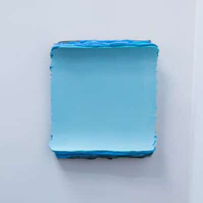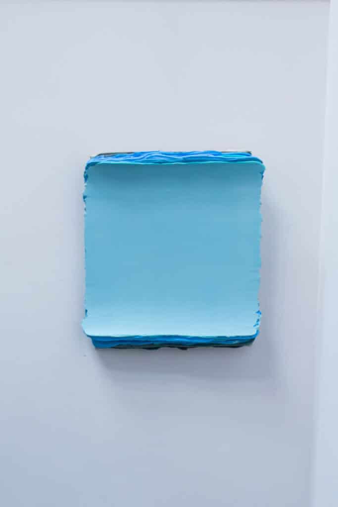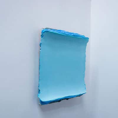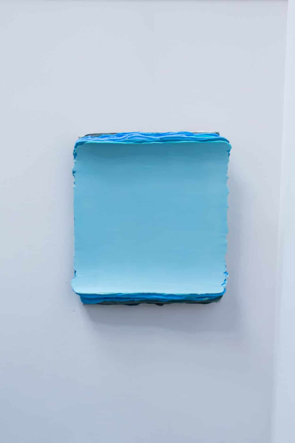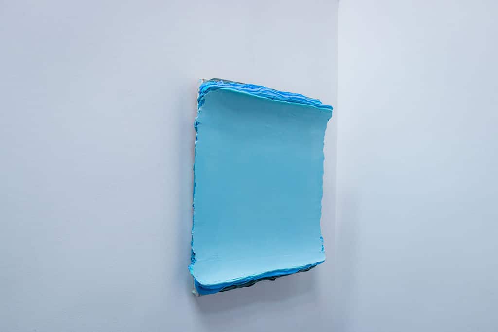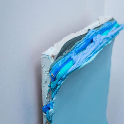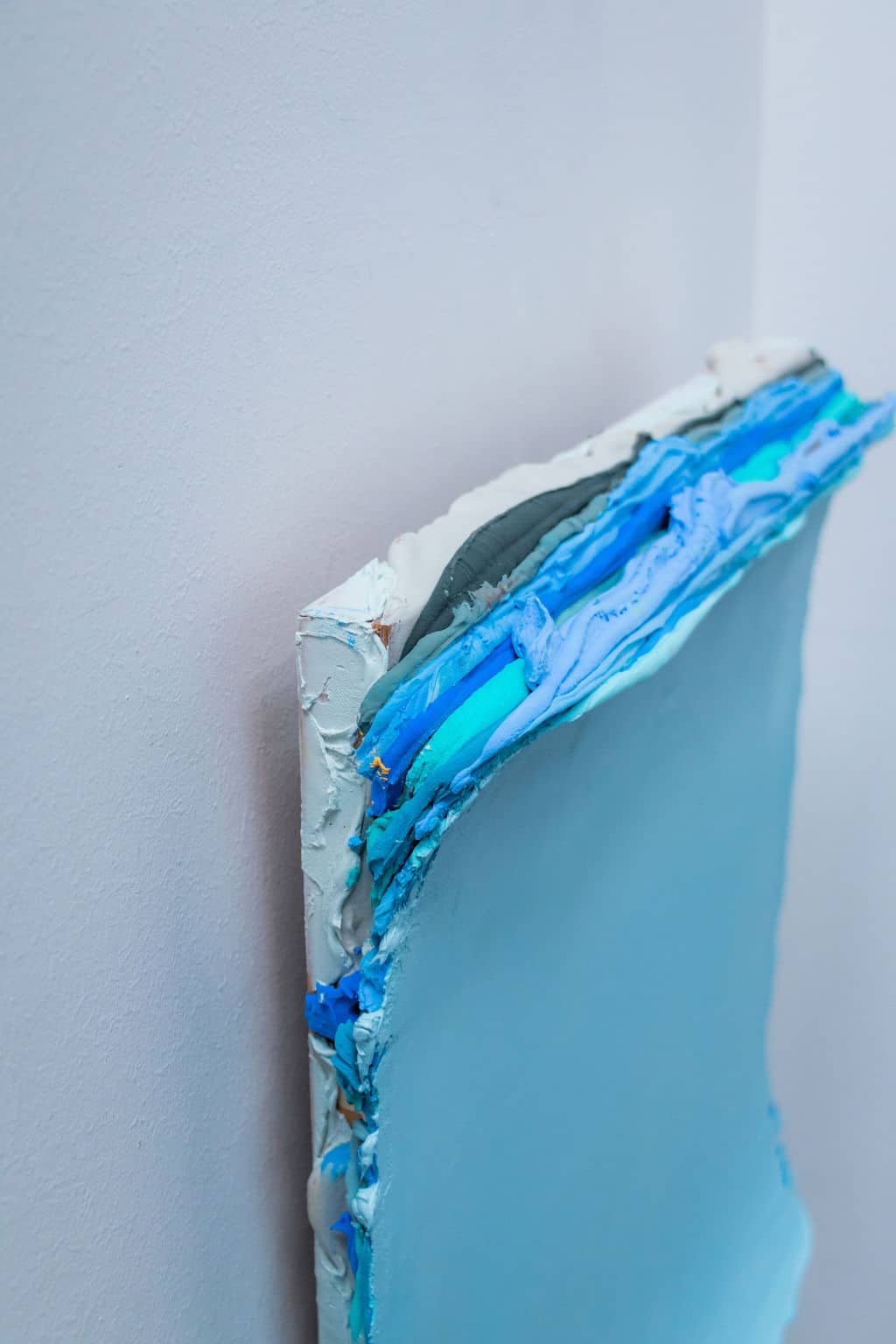 Abstract werk met grove lagen in hemelsblauw door Robbert Fortgens (2021).