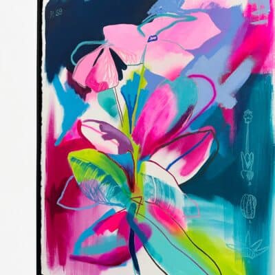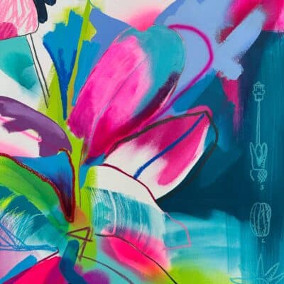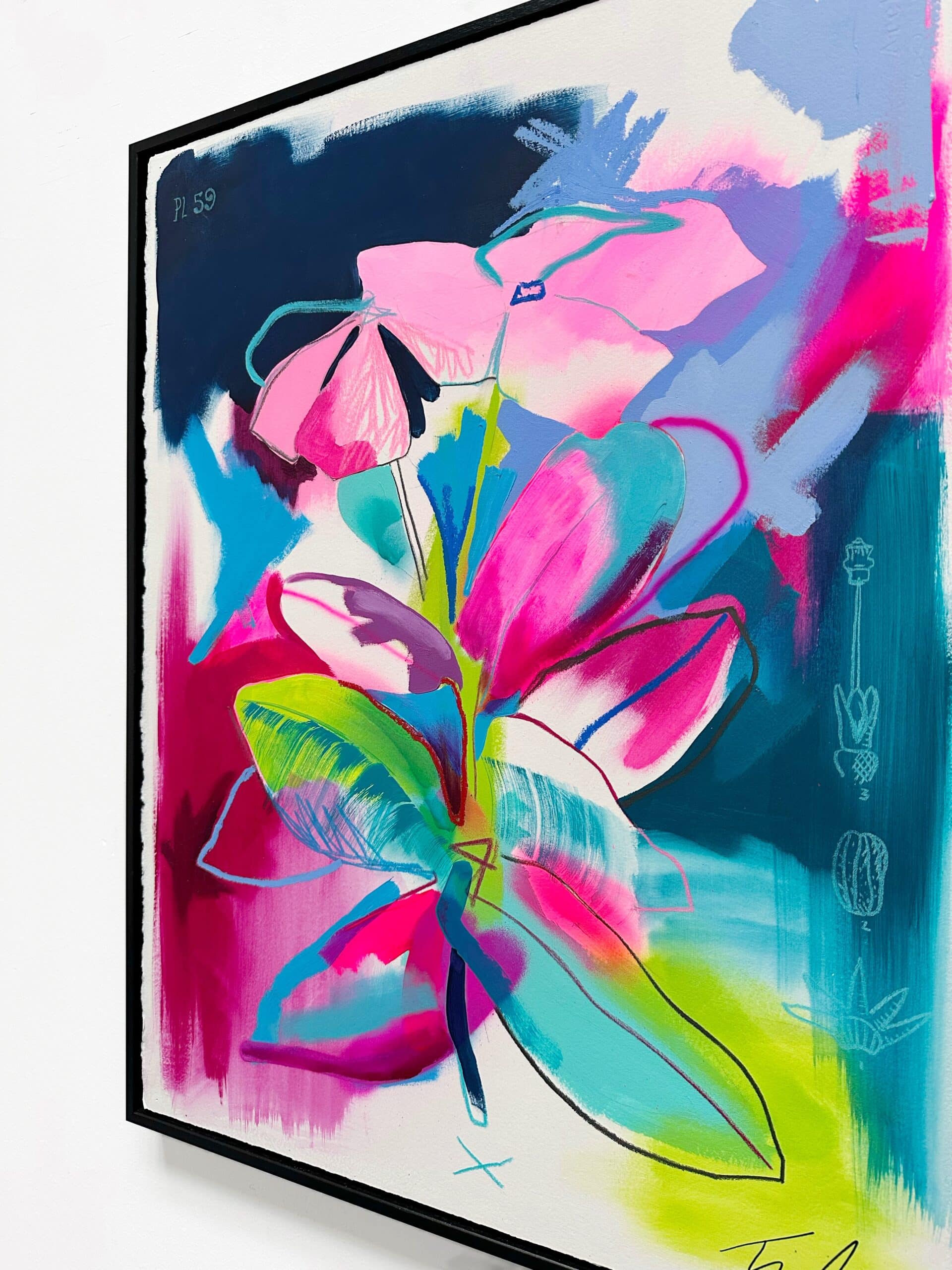 Fowler takes inspiration from exotic and migratory plants reflecting his own DNA, from west Africa, via the Caribbean to the UK. He subverts traditional and contemporary methods of applying oil, acrylic, spray, enamel and graffiti inks using brushes, different aperture caps and marker paint mops to orchestrate purposeful marks, strokes, drips, scrapes and smears across the canvas whilst constructing his exciting and dynamic artworks.