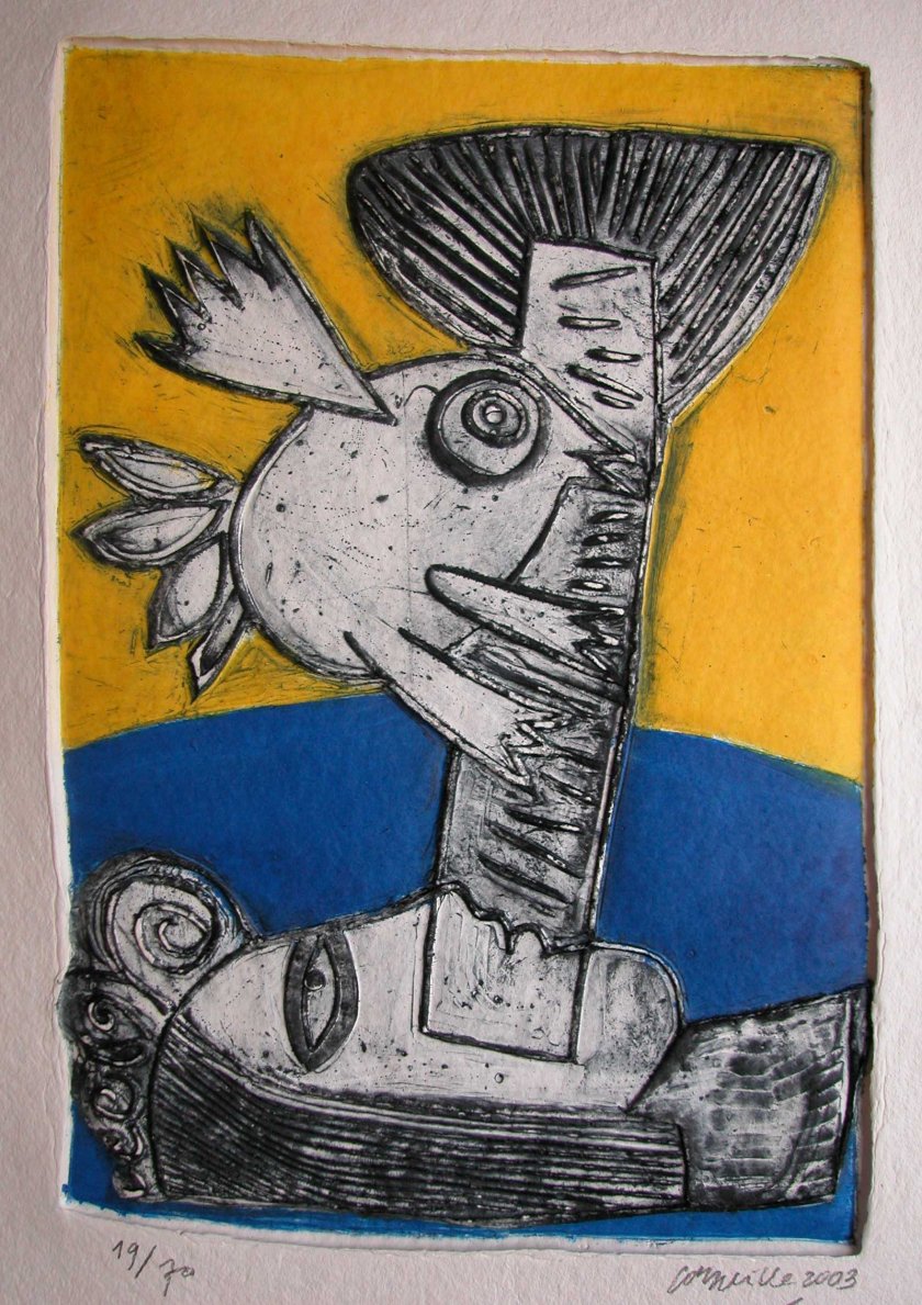 Zeer exclusieve aquagravure van Corneille getiteld Effervescence de L’ete. De aquagravure is een zeldzaam gebruikte (zeef)druk techniek waarbij zwaar hangeschept papier als het nat is in een relïef wordt geperst. Daarna wordt het kunstwerk met de hand ingeschilderd! Zeer bewerkelijke techniek en dus zelden toegepast. Het werk is in een bijzonder beperkte oplage van slechts 70 stuks geproduceerd en is op een hele bijzondere manier in een fraaie handgemaakte lijst ingelijst!