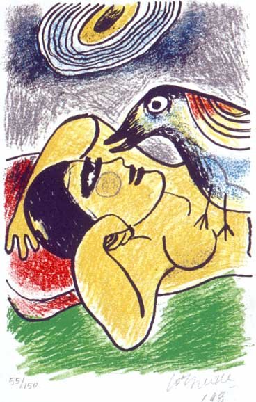 Prachtige zeefdruk uit de schitterende verzameleditie “Femmes et Oiseaux II”” van Corneille uit 1998. De zware katoenen casette heeft een plexiglas inleg die 3 prachtige zeefdrukken herbergt. De bijbehorende gedichtenbundel van Arthur Lindkvist is door Corneille geïllustreerd en voor de verzamelcassette is een aantal van die illustraties door Corneille als zeefdruk vervaardigd. Van 1 van de cassettes hebben we de zeefdrukken los ingelijst en zijn ze bij uitzondering los verkrijgbaar (u krijgt er wel de bijbehorende gedichtenbundel van Arthur Lindkvist gratis bij!). De zeefdrukken zijn fraai met bijpassende handgemaakte zilverkleurige lijsten ingelijst”