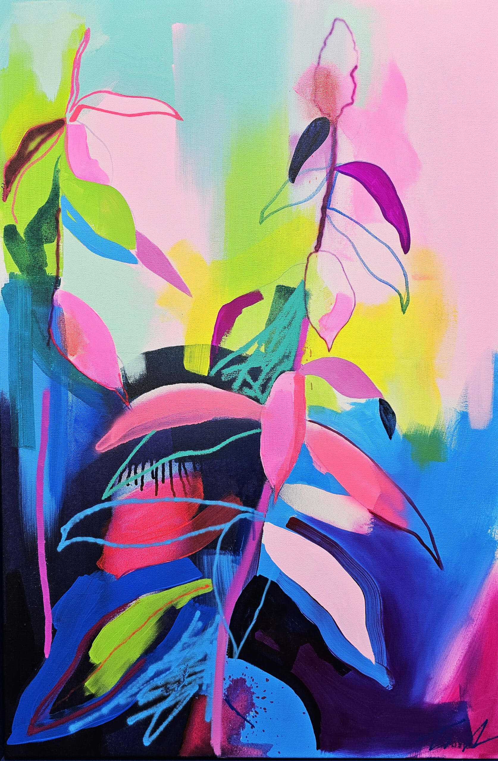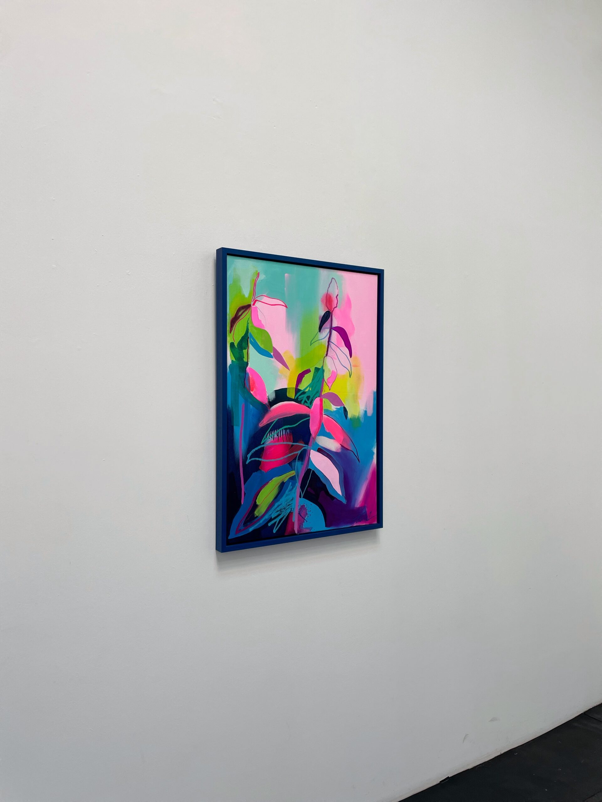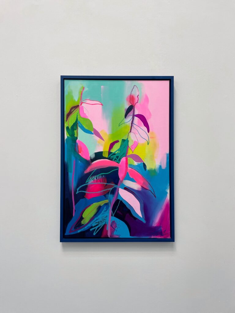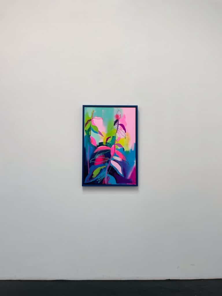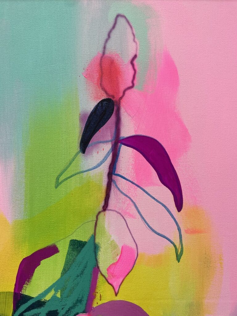 Fowler takes inspiration from exotic and migratory plants reflecting his own DNA, from west Africa, via the Caribbean to the UK. He subverts traditional and contemporary methods of applying oil, acrylic, spray, enamel and graffiti inks using brushes, different aperture caps and marker paint mops to orchestrate purposeful marks, strokes, drips, scrapes and smears across the canvas whilst constructing his exciting and dynamic artworks.